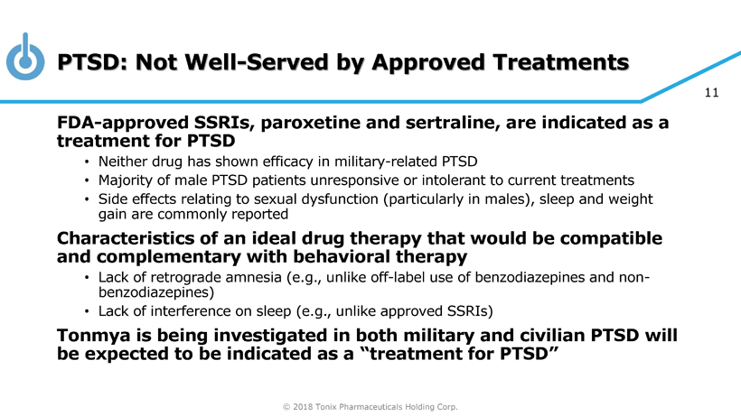 © 2018 Tonix Pharmaceuticals Holding Corp. 10 Tonmya: Novel Mechanism Targets Sleep Quality for Recovery from PTSD PTSD is a disorder of recovery • Most people exposed to extreme trauma recover over a few weeks • In PTSD, recovery process impeded due to insufficient sleep - dependent memory processing Memory processing is essential to recovery • Vulnerability to memory intrusions and trauma triggers remains if no consolidation of new learning (extinction) Tonmya targets sleep quality 1 • The active ingredient in Tonmya, cyclobenzaprine, interacts with receptors that regulate sleep quality: strongly binds and potently blocks 5 - HT 2A , a 1 - adrenergic and histamine H 1 receptors, permissive to sleep - dependent recovery processes 1 Daugherty et al., Abstract 728, Society of Biological Psychiatry 70th Annual Scientific Convention, May 14 - 16, 2015, Toronto On tario, Canada