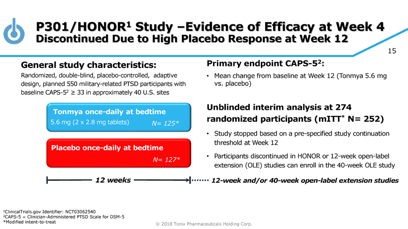 © 2018 Tonix Pharmaceuticals Holding Corp. 14 P201/AtEase Study P201 was a large adequate well - controlled Phase 2 study in military - related PTSD • Primary endpoint (Week 12 CAPS - 5) did not separate from placebo for TNX - 102 SL 2.8 mg • No safety or tolerability issue discovered • Retrospective analyses showed TNX - 102 SL 5.6 mg had a strong signal of treatment effect at Week 12 CAPS - 5 (P=0.053) and CGI - I (P=0.041) scores • Retrospective analyses suggested CAPS - 5 ≥ 33 enrollment criteria for Phase 3