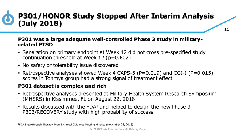 © 2018 Tonix Pharmaceuticals Holding Corp. 15 P301/HONOR 1 Study – Evidence of Efficacy at Week 4 Discontinued Due to High Placebo Response at Week 12 Primary e ndpoint CAPS - 5 2 : • Mean change from baseline at W eek 12 (Tonmya 5.6 mg vs. placebo ) Unblinded interim analysis at 274 randomized participants ( mITT * N= 252) • Study stopped based on a pre - specified study continuation threshold at Week 12 • Participants discontinued in HONOR or 12 - week open - label extension (OLE) studies can enroll in the 40 - week OLE study Placebo once - daily at bedtime 12 weeks Tonmya once - daily at bedtime N= 127* N= 125* 5.6 mg (2 x 2.8 mg tablets) General s tudy c haracteristics: Randomized, double - blind, placebo - controlled , adaptive design, planned 550 military - related PTSD participants with baseline CAPS - 5 2 ≥ 33 in approximately 40 U.S. sites 12 - week and/or 40 - week open - label extension studies 1 ClinicalTrials.gov Identifier: NCT03062540 2 CAPS - 5 = Clinician - Administered PTSD Scale for DSM - 5 *Modified intent - to - treat