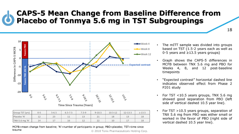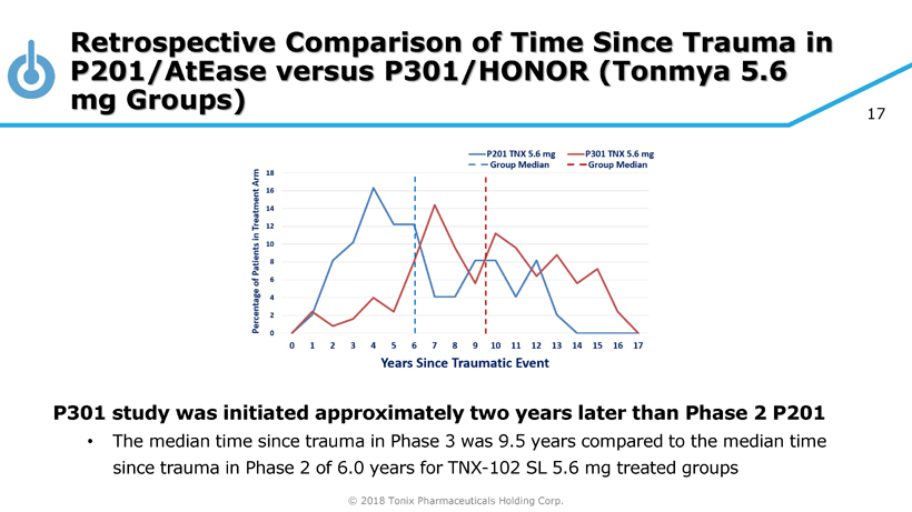 © 2018 Tonix Pharmaceuticals Holding Corp. 17 Retrospective Comparison of Time Since Trauma in P201/AtEase versus P301/HONOR (Tonmya 5.6 mg Groups) P301 study was initiated approximately two years later than Phase 2 P201 • The median time since trauma in Phase 3 was 9.5 years compared to the median time since trauma in Phase 2 of 6.0 years for TNX - 102 SL 5.6 mg treated groups