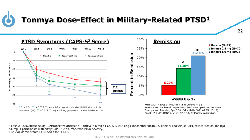 © 2018 Tonix Pharmaceuticals Holding Corp. 21 Sustained Remission in Phase 2 and Phase 3 Studies: Retrospective Analyses of P201 Entry CAPS - 5 ≥33 and P301 ≤9 Years Since Trauma Subgroups Remission is a clinical state that is essentially asymptomatic In order to confirm remission: • Determined rates of participants who met remission status at both Week 8 and Week 12 Rate of remission in ≤9 years since trauma group in P301 is similar to baseline CAPS - 5 ≥ 33 group in P201 1 1 Majority of P201 participants were ≤ 9 years since trauma and ~80% of P201 participants and all of P301 participants were ≥ 33 CAPS - 5 at baseline