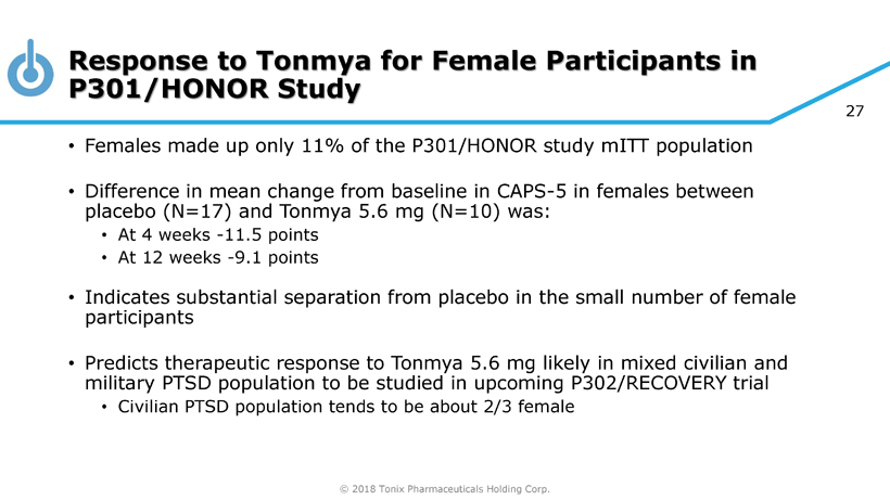 © 2018 Tonix Pharmaceuticals Holding Corp. 26 Time Since Trauma – Remitting and Persistent Phases of PTSD Kessler et al 1 studied remission in PTSD with and without therapy • Identified remitting and persistent phase of PTSD – with transition at approximately 6 years post trauma • Supported by other studies 2 - 6 1 Kessler et al. Arch Gen Psychiatry 1995;52:1048 - 1060. 2 Armenta et al. BMC Psychiatry 2018;18:48. 3 Galatzer - Levy et al. PLOS ONE 2013;8:e70084. 4 Perkonigg et al. Am J Psychiatry 2005;162:1320 - 1327. 5 Santiago et al. PLOS ONE 2013;8:e59236. 6 Davidson & Connor. Eur Neuropsychopharmacol 2001;11(Supp3):S148 - S149.