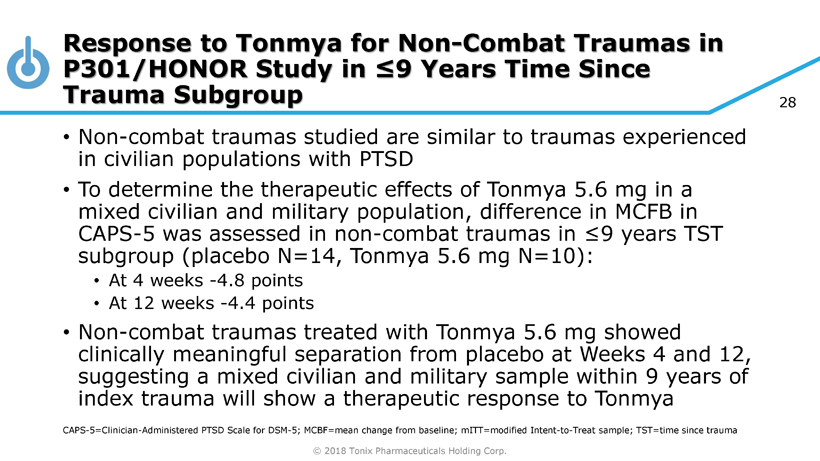 © 2018 Tonix Pharmaceuticals Holding Corp. 27 Response to Tonmya for Female Participants in P301/HONOR Study • Females made up only 11% of the P301/HONOR study mITT population • Difference in mean change from baseline in CAPS - 5 in females between placebo (N=17) and Tonmya 5.6 mg (N=10) was: • At 4 weeks - 11.5 points • At 12 weeks - 9.1 points • Indicates substantial separation from placebo in the small number of female participants • Predicts therapeutic response to Tonmya 5.6 mg likely in mixed civilian and military PTSD population to be studied in upcoming P302/RECOVERY trial • Civilian PTSD population tends to be about 2/3 female