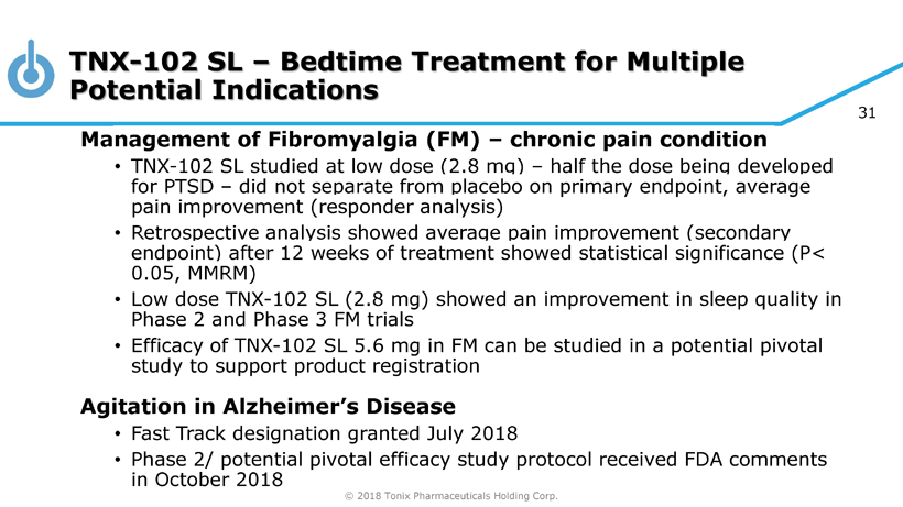 © 2018 Tonix Pharmaceuticals Holding Corp. 30 New Phase 3 P302/RECOVERY Study – To Start 1Q 2019 Primary e ndpoint CAPS - 5 1 : • Mean change from baseline at W eek 4 (Tonmya 5.6 mg vs. placebo ) Key Secondary e ndpoint s include: • CAPS - 5 m ean change from baseline at W eek 12 (Tonmya 5.6 mg vs. placebo ) Potential pivotal efficacy study to support NDA approval Placebo once - daily at bedtime 12 weeks Tonmya once - daily at bedtime 5.6 mg (2 x 2.8 mg tablets) General s tudy c haracteristics: • Randomized, double - blind, placebo - controlle d study with baseline CAPS - 5 1 ≥ 33 in approximately 25 U.S. sites • Enrollment restricted to study participants with PTSD who experienced an index trauma ≤ 9 years from the date of screening • Both civilian and military - related PTSD to be included 12 - week open - label extension study 1 CAPS - 5 = Clinician - Administered PTSD Scale for DSM - 5 Primary e ndpoint CAPS - 5 1 at Week 4 N= 125 N= 125