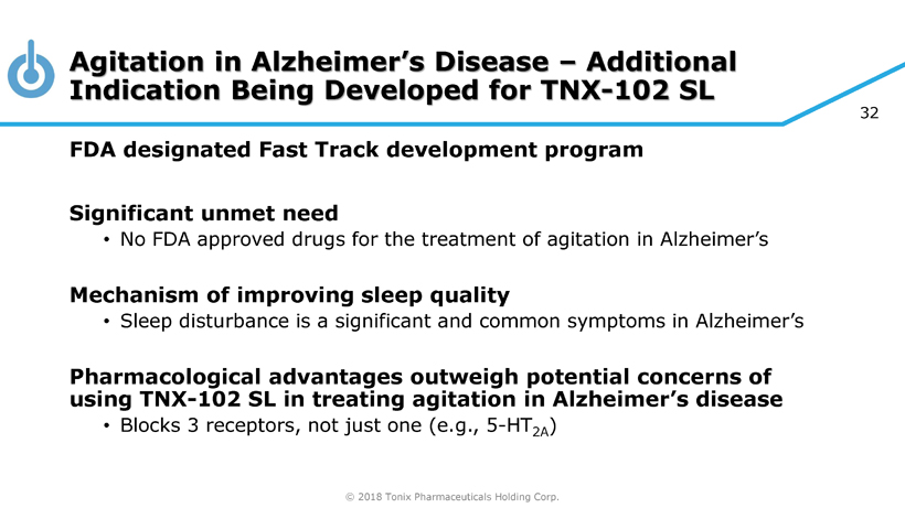 © 2018 Tonix Pharmaceuticals Holding Corp. 31 TNX - 102 SL – Bedtime Treatment for Multiple Potential Indications Ma nagement of Fibromyalgia (FM) – chronic pain condition • TNX - 102 SL studied at low dose (2.8 mg) – half the dose being developed for PTSD – did not separate from placebo on primary endpoint, average pain improvement (responder analysis) • Retrospective analysis showed average pain improvement (secondary endpoint) after 12 weeks of treatment showed statistical significance (P< 0.05, MMRM) • Low dose TNX - 102 SL (2.8 mg) showed an improvement in sleep quality in Phase 2 and Pha se 3 FM trials • Efficacy of TNX - 102 SL 5.6 mg in FM can be studied in a potential pivotal study to support product registration Agitation in Alzheimer’s Disease • Fast Track designation granted July 2018 • Phase 2/ potential pivotal efficacy study protocol received FDA comments in October 2018