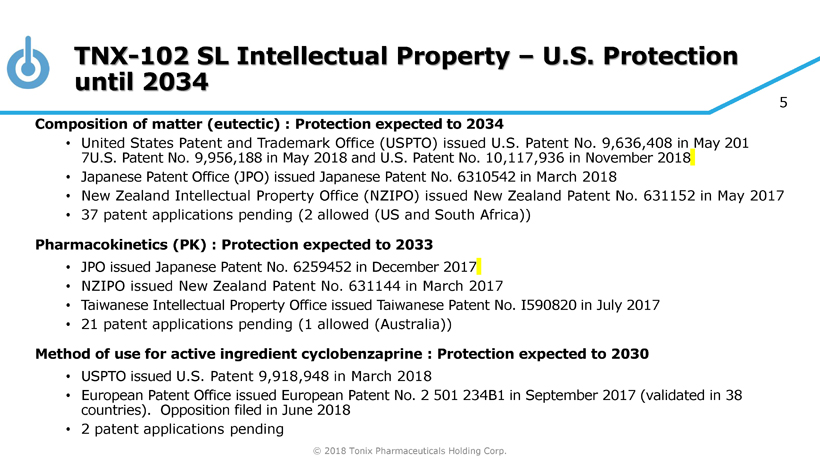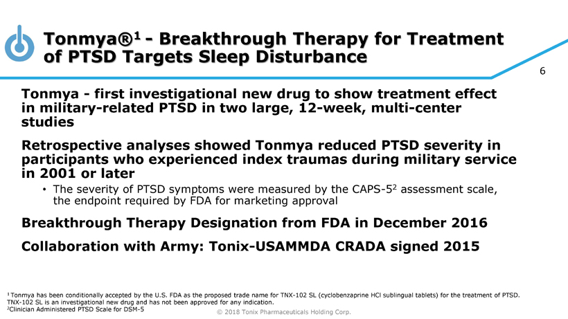 © 2018 Tonix Pharmaceuticals Holding Corp. 5 TNX - 102 SL Intellectual Property – U.S. Protection until 2034 Composition of matter (eutectic) : Protection expected to 2034 • United States Patent and Trademark Office (USPTO) issued U.S. Patent No. 9,636,408 in May 201 7U.S. Patent No. 9,956,188 in May 2018 and U.S. Patent No. 10,117,936 in November 2018 • Japanese Patent Office (JPO) issued Japanese Patent No. 6310542 in March 2018 • New Zealand Intellectual Property Office (NZIPO) issued New Zealand Patent No. 631152 in May 2017 • 37 patent applications pending (2 allowed (US and South Africa)) Pharmacokinetics (PK) : Protection expected to 2033 • JPO issued Japanese Patent No. 6259452 in December 2017 • NZIPO issued New Zealand Patent No. 631144 in March 2017 • Taiwanese Intellectual Property Office issued Taiwanese Patent No. I590820 in July 2017 • 21 patent applications pending (1 allowed (Australia)) Method of use for active ingredient cyclobenzaprine : Protection expected to 2030 • USPTO issued U.S. Patent 9,918,948 in March 2018 • European Patent Office issued European Patent No. 2 501 234B1 in September 2017 (validated in 38 countries). Opposition filed in June 2018 • 2 patent applications pending