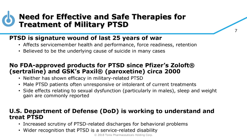 © 2018 Tonix Pharmaceuticals Holding Corp. 6 Tonmya® 1 - Breakthrough Therapy for Treatment of PTSD Targets Sleep Disturbance Tonmya - first investigational new drug to show treatment effect in military - related PTSD in two large, 12 - week, multi - center studies Retrospective analyses showed Tonmya reduced PTSD severity in participants who experienced index traumas during military service in 2001 or later • The severity of PTSD symptoms were measured by the CAPS - 5 2 assessment scale, the endpoint required by FDA for marketing approval Breakthrough Therapy Designation from FDA in December 2016 Collaboration with Army: Tonix - USAMMDA CRADA signed 2015 1 Tonmya has been conditionally accepted by the U.S. FDA as the proposed trade name for TNX - 102 SL (cyclobenzaprine HCl sublingual tablets) for the treatment of PTSD. TNX - 102 SL is an investigational new drug and has not been approved for any indication. 2 Clinician Administered PTSD Scale for DSM - 5
