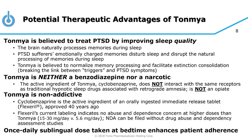 © 2018 Tonix Pharmaceuticals Holding Corp. 7 Need for Effective and Safe Therapies for Treatment of Military PTSD PTSD is signature wound of last 25 years of war • Affects servicemember health and performance, force readiness, retention • Believed to be the underlying cause of suicide in many cases No FDA - approved products for PTSD since Pfizer’s Zoloft® (sertraline) and GSK’s Paxil® (paroxetine) circa 2000 • Neither has shown efficacy in military - related PTSD • Male PTSD patients often unresponsive or intolerant of current treatments • Side effects relating to sexual dysfunction (particularly in males), sleep and weight gain are commonly reported U.S. Department of Defense (DoD) is working to understand and treat PTSD • Increased scrutiny of PTSD - related discharges for behavioral problems • Wider recognition that PTSD is a service - related disability