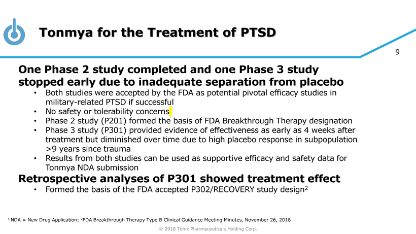 © 2018 Tonix Pharmaceuticals Holding Corp. 8 Potential Therapeutic Advantages of Tonmya Tonmya is believed to treat PTSD by improving sleep quality • The brain naturally processes memories during sleep • PTSD sufferers’ emotionally charged memories disturb sleep and disrupt the natural processing of memories during sleep • Tonmya is believed to normalize memory processing and facilitate extinction consolidation (breaking the link between “triggers” and PTSD symptoms) Tonmya is NEITHER a benzodiazepine nor a narcotic • The active ingredient of Tonmya , cyclobenzaprine, does NOT interact with the same receptors as traditional hypnotic sleep drugs associated with retrograde amnesia; is NOT an opiate Tonmya is non - addictive • Cyclobenzaprine is the active ingredient of an orally ingested immediate release tablet (Flexeril ® ), approved 40 years ago • Flexeril’s current labeling indicates no abuse and dependence concern at higher doses than Tonmya ( 15 - 30 mg/day v. 5.6 mg/day ); NDA can be filed without drug abuse and dependency assessment studies Once - daily sublingual dose taken at bedtime enhances patient adherence