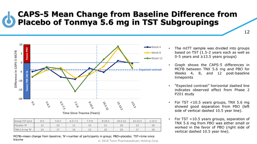 © 2018 Tonix Pharmaceuticals Holding Corp. 11 Retrospective Comparison of Time Since Trauma in P201/AtEase versus P301/HONOR (Tonmya 5.6 mg Groups) P301 study was initiated approximately two years later than Phase 2 P201 • The median time since trauma in Phase 3 was 9.5 years compared to the median time since trauma in Phase 2 of 6.0 years for TNX - 102 SL 5.6 mg treated groups