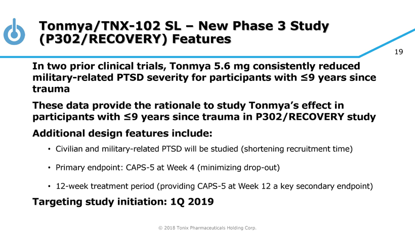 © 2018 Tonix Pharmaceuticals Holding Corp. 18 Summary of Clinical Experience with Tonmya/ TNX - 102 SL in PTSD Median time since trauma (TST) in TNX - 102 SL 5.6 mg group in the P301/HONOR study (9.5 years) was longer than P201/AtEase study (6 years) • Both studied military - related PTSD • Time has passed since the surge in Iraq In retrospective analysis, the ≤ 9 year subgroup of P301 study had similar results as the P201 study (primary and secondary) • TST is important in placebo - controlled clinical study • Potential enrichment in ≤ 9 years TST subgroup for treatment responders The ≤ 9 year subgroup of P301 may be enriched for “Remitting Phase” of PTSD 1 - 4 • Expect remitting phase of PTSD is more amenable to drug studies Results from retrospective analyses lead to improved Phase 3 study design 1 Kessler et al. Arch Gen Psychiatry 1995;52:1048 - 1060. 2 Armenta et al. BMC Psychiatry 2018;18:48. 3 Galatzer - Levy et al. PLOS ONE 2013;8:e70084. 4 Perkonigg et al. Am J Psychiatry 2005;162:1320 - 1327.