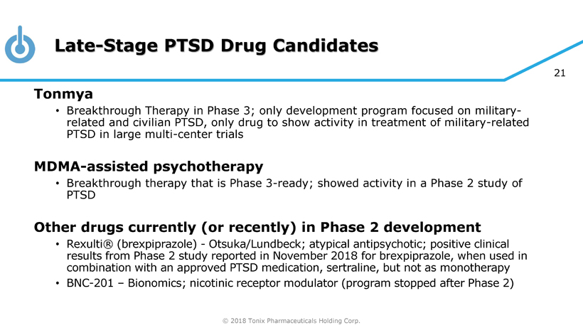 © 2018 Tonix Pharmaceuticals Holding Corp. 20 New Phase 3 P302/RECOVERY Study – To Start 1Q 2019 Primary e ndpoint CAPS - 5 1 : • Mean change from baseline at W eek 4 (Tonmya 5.6 mg vs. placebo ) Key Secondary e ndpoint s include: • CAPS - 5 m ean change from baseline at W eek 12 (Tonmya 5.6 mg vs. placebo ) Potential pivotal efficacy study to support NDA approval Placebo once - daily at bedtime 12 weeks Tonmya once - daily at bedtime 5.6 mg (2 x 2.8 mg tablets) General s tudy c haracteristics: • Randomized, double - blind, placebo - controlle d study with baseline CAPS - 5 1 ≥ 33 in approximately 25 U.S. sites • Enrollment restricted to study participants with PTSD who experienced an index trauma ≤ 9 years from the date of screening • Both civilian and military - related PTSD to be included 12 - week open - label extension study 1 CAPS - 5 = Clinician - Administered PTSD Scale for DSM - 5 Primary e ndpoint CAPS - 5 1 at Week 4 N= 125 N= 125