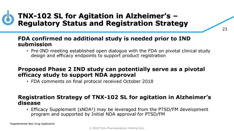 © 2018 Tonix Pharmaceuticals Holding Corp. 22 TNX - 102 SL – Bedtime Treatment for Multiple Potential Indications Ma nagement of Fibromyalgia (FM) – chronic pain condition • TNX - 102 SL studied at low dose (2.8 mg) – half the dose being developed for PTSD – did not separate from placebo on primary endpoint, average pain improvement (responder analysis) • Retrospective analysis showed average pain improvement (secondary endpoint) after 12 weeks of treatment showed statistical significance (P< 0.05, MMRM) • Low dose TNX - 102 SL (2.8 mg) showed an improvement in sleep quality in Phase 2 and Pha se 3 FM trials • Efficacy of TNX - 102 SL 5.6 mg in FM can be studied in a potential pivotal study to support product registration Agitation in Alzheimer’s Disease • Fast Track designation granted July 2018 • Phase 2/ potential pivotal efficacy study protocol received FDA comments in October 2018
