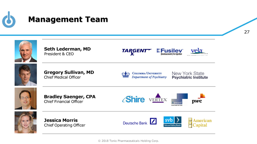© 2018 Tonix Pharmaceuticals Holding Corp. 26 TNX - 801 (Synthesized Live Horsepox Virus): A Smallpox - Preventing Vaccine Candidate Pre - IND Stage Potential improvement over current biodefense tools against smallpox ✓ Leverages Tonix’s government affairs effort ✓ Collaboration with Professor David Evans and Dr. Ryan Noyce at University of Alberta ✓ Demonstrated protective vaccine activity in mice ✓ Patent application on novel vaccine submitted Regulatory strategy • We intend to meet with FDA to discuss the most efficient and appropriate investigational plan to support the licensure, either: ✓ Application of the “Animal Rule”, or ✓ Conducting an active comparator study using ACAM2000 • Good Manufacturing Practice (GMP) viral production process in development Targeting a Potential Public Health Issue Material threat medical countermeasure under 21 st Century Cures Act • Qualifies for Priority Review Voucher (PRV) upon licensure * ✓ PRVs have no expiration date, are transferrable and have sold for ~$125 M *BLA/NDA priority 6 - month review is expected.