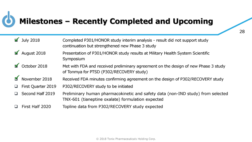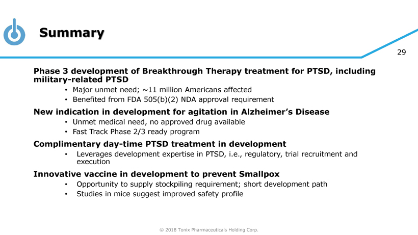 © 2018 Tonix Pharmaceuticals Holding Corp. 28 Milestones – Recently Completed and Upcoming □ July 201 8 Completed P301/HONOR study interim analysis - result did not support study continuation but strengthened new Phase 3 study □ August 201 8 Presentation of P301/HONOR study results at Military Health System Scientific Symposium □ October 201 8 Met with FDA and received preliminary agreement on the design of new Phase 3 study of Tonmya for PTSD (P302/RECOVERY study) □ November 201 8 Received FDA minutes confirming agreement on the design of P302/RECOVERY study □ First Quarter 2019 P302/RECOVERY study to be initiated □ Second Half 2019 P reliminary human pharmacokinetic and safety data (non - IND study) from selected TNX - 601 (tianeptine oxalate) formulation expected □ First Half 2020 Topline data from P302/RECOVERY study expected x x x x