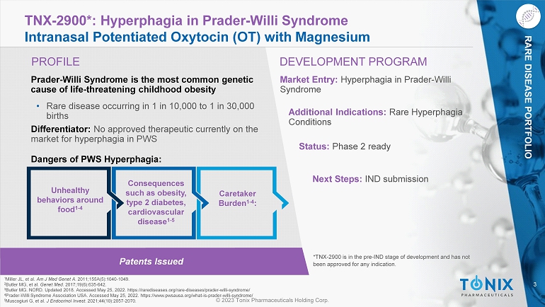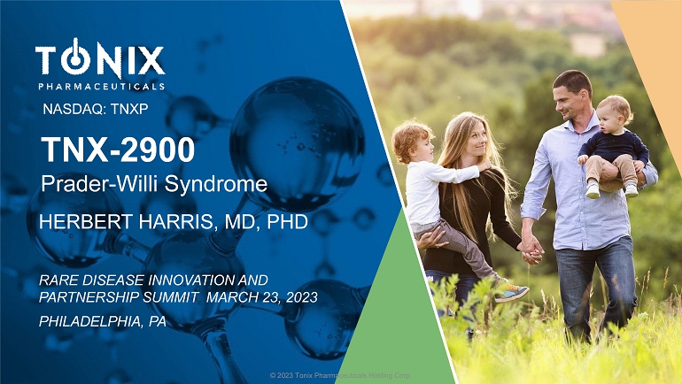 © 2023 Tonix Pharmaceuticals Holding Corp. TNX - 2900 Prader - Willi Syndrome HERBERT HARRIS, MD, PHD RARE DISEASE INNOVATION AND PARTNERSHIP SUMMIT MARCH 23, 2023 PHILADELPHIA, PA NASDAQ: TNXP