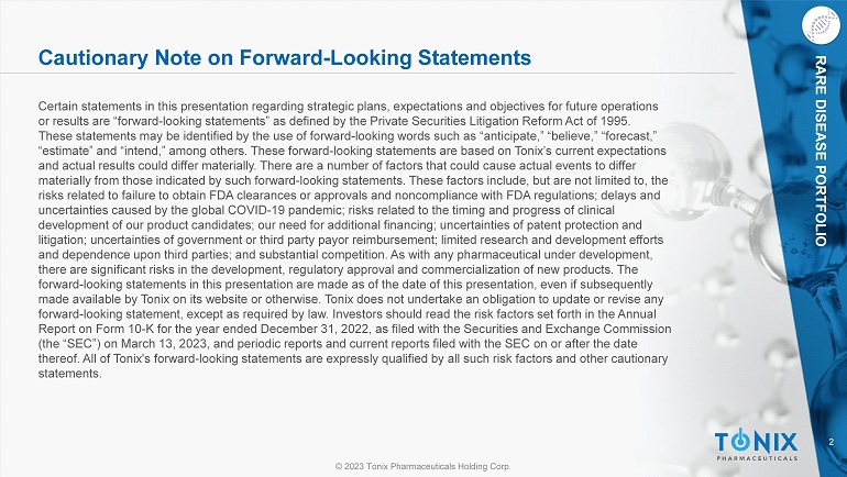 2 © 2023 Tonix Pharmaceuticals Holding Corp. RARE DISEASE PORTFOLIO Cautionary Note on Forward - Looking Statements Certain statements in this presentation regarding strategic plans, expectations and objectives for future operations or results are “forward - looking statements” as defined by the Private Securities Litigation Reform Act of 1995. These statements may be identified by the use of forward - looking words such as “anticipate,” “believe,” “forecast,” “estimate” and “intend,” among others. These forward - looking statements are based on Tonix’s current expectations and actual results could differ materially. There are a number of factors that could cause actual events to differ materially from those indicated by such forward - looking statements. These factors include, but are not limited to, the risks related to failure to obtain FDA clearances or approvals and noncompliance with FDA regulations; delays and uncertainties caused by the global COVID - 19 pandemic; risks related to the timing and progress of clinical development of our product candidates; our need for additional financing; uncertainties of patent protection and litigation; uncertainties of government or third party payor reimbursement; limited research and development efforts and dependence upon third parties; and substantial competition. As with any pharmaceutical under development, there are significant risks in the development, regulatory approval and commercialization of new products. The forward - looking statements in this presentation are made as of the date of this presentation, even if subsequently made available by Tonix on its website or otherwise. Tonix does not undertake an obligation to update or revise any forward - looking statement, except as required by law. Investors should read the risk factors set forth in the Annual Report on Form 10 - K for the year ended December 31, 2022, as filed with the Securities and Exchange Commission (the “SEC”) on March 13, 2023, and periodic reports and current reports filed with the SEC on or after the date thereof. All of Tonix's forward - looking statements are expressly qualified by all such risk factors and other cautionary statements.