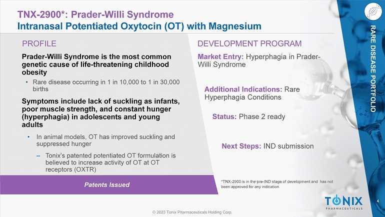 3 © 2023 Tonix Pharmaceuticals Holding Corp. RARE DISEASE PORTFOLIO Patents Issued PROFILE DEVELOPMENT PROGRAM TNX - 2900*: Hyperphagia in Prader - Willi Syndrome Intranasal Potentiated Oxytocin (OT) with Magnesium Prader - Willi Syndrome is the most common genetic cause of life - threatening childhood obesity • Rare disease occurring in 1 in 10,000 to 1 in 30,000 births Differentiator: No approved therapeutic currently on the market for hyperphagia in PWS Dangers of PWS Hyperphagia: Market Entry: Hyperphagia in Prader - Willi Syndrome Additional Indications: Rare Hyperphagia Conditions Status: Phase 2 ready Next Steps: IND submission *TNX - 2900 is in the pre - IND stage of development and has not been approved for any indication. Caretaker Burden 1 - 4 : Unhealthy behaviors around food 1 - 4 Consequences such as obesity, type 2 diabetes, cardiovascular disease 1 - 5 1 Miller JL, et al. Am J Med Genet A . 2011;155A(5):1040 - 1049. 2 Butler MG, et al. Genet Med. 2017;19(6):635 - 642. 3 Butler MG. NORD. Updated 2018. Accessed May 25, 2022. https://rarediseases.org/rare - diseases/prader - willi - syndrome/ 4 Prader - Willi Syndrome Association USA. Accessed May 25, 2022. https://www.pwsausa.org/what - is - prader - willi - syndrome/ 5 Muscogiuri G, et al. J Endocrinol Invest . 2021;44(10):2057 - 2070.