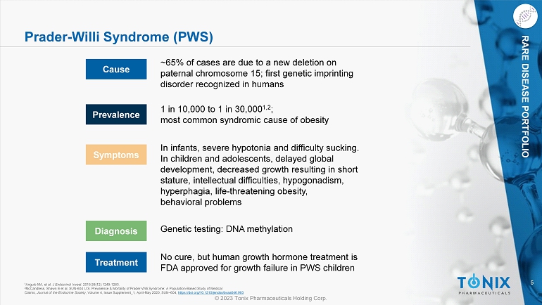 4 © 2023 Tonix Pharmaceuticals Holding Corp. RARE DISEASE PORTFOLIO Patents Issued PROFILE DEVELOPMENT PROGRAM TNX - 2900*: Prader - Willi Syndrome Intranasal Potentiated Oxytocin (OT) with Magnesium Prader - Willi Syndrome is the most common genetic cause of life - threatening childhood obesity • Rare disease occurring in 1 in 10,000 to 1 in 30,000 births Symptoms include lack of suckling as infants, poor muscle strength, and constant hunger (hyperphagia) in adolescents and young adults • In animal models, OT has improved suckling and suppressed hunger ‒ Tonix’s patented potentiated OT formulation is believed to increase activity of OT at OT receptors (OXTR) Market Entry: Hyperphagia in Prader - Willi Syndrome Additional Indications: Rare Hyperphagia Conditions Status: Phase 2 ready Next Steps: IND submission *TNX - 2900 is in the pre - IND stage of development and has not been approved for any indication.
