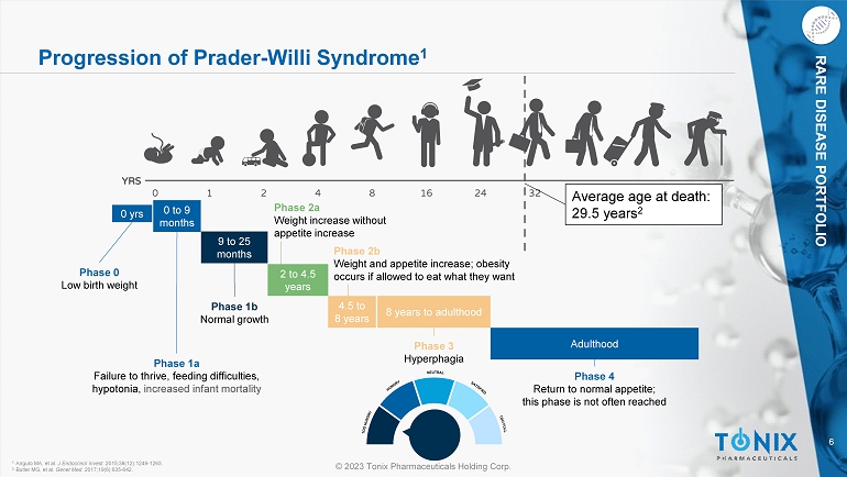 5 © 2023 Tonix Pharmaceuticals Holding Corp. RARE DISEASE PORTFOLIO Prader - Willi Syndrome (PWS) Cause Prevalence Symptoms a 65% of cases are due to a new deletion on paternal chromosome 15; first genetic imprinting disorder recognized in humans Diagnosis 1 in 10,000 to 1 in 30,000 1,2 ; most common syndromic cause of obesity In infants, severe hypotonia and difficulty sucking. In children and adolescents, delayed global development, decreased growth resulting in short stature, intellectual difficulties, hypogonadism, hyperphagia, life - threatening obesity, behavioral problems Genetic testing: DNA methylation 1 Angulo MA, et al. J Endocrinol Invest. 2015;38(12):1249 - 1263. 2 McCandless, Shawn E et al. SUN - 604 U.S. Prevalence & Mortality of Prader - Willi Syndrome: A Population - Based Study of Medical Claims, Journal of the Endocrine Society , Volume 4, Issue Supplement_1, April - May 2020, SUN – 604, https://doi.org/10.1210/jendso/bvaa046.993 Treatment No cure, but human growth hormone treatment is FDA approved for growth failure in PWS children