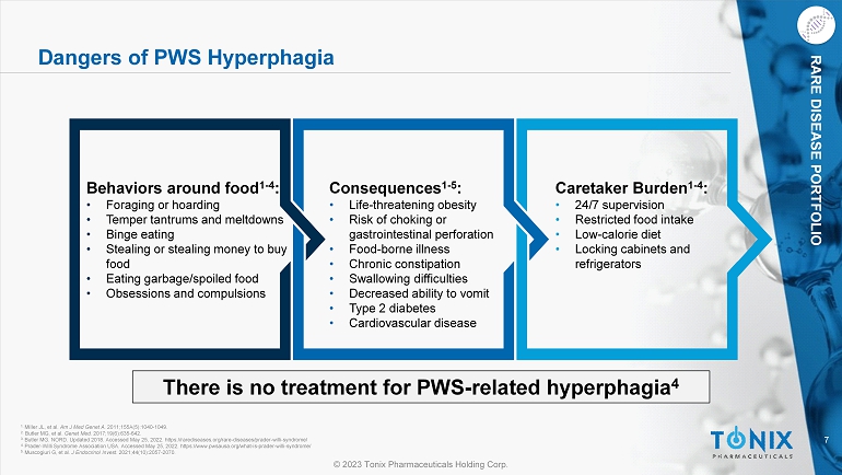 6 © 2023 Tonix Pharmaceuticals Holding Corp. RARE DISEASE PORTFOLIO Progression of Prader - Willi Syndrome 1 0 yrs 0 to 9 months 9 to 25 months 2 to 4.5 years 4.5 to 8 years 8 years to adulthood Adulthood Average age at death: 29.5 years 2 Phase 0 Low birth weight Phase 1a Failure to thrive, feeding difficulties, hypotonia, increased infant mortality Phase 1b Normal growth Phase 2a Weight increase without appetite increase Phase 2b Weight and appetite increase; obesity occurs if allowed to eat what they want Phase 3 Hyperphagia Phase 4 Return to normal appetite; this phase is not often reached 1. Angulo MA, et al. J Endocrinol Invest. 2015;38(12):1249 - 1263. 2. Butler MG, et al. Genet Med . 2017;19(6):635 - 642.