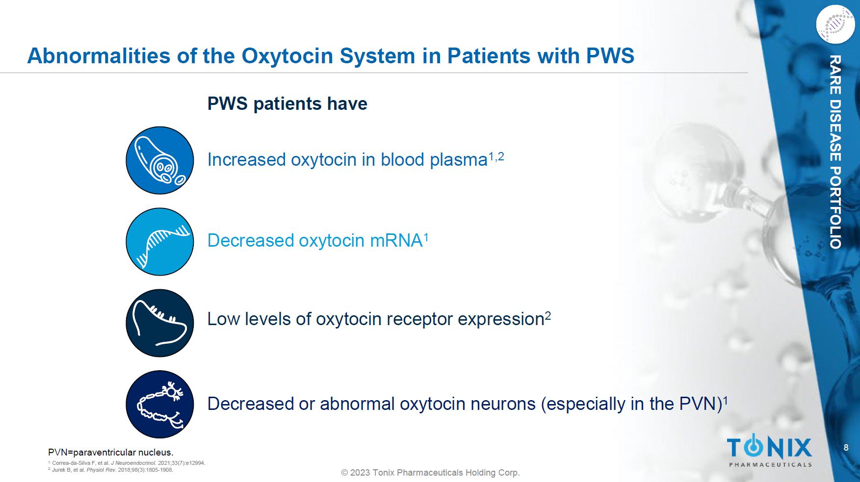 7 © 2023 Tonix Pharmaceuticals Holding Corp. RARE DISEASE PORTFOLIO Dangers of PWS Hyperphagia Caretaker Burden 1 - 4 : • 24/7 supervision • Restricted food intake • Low - calorie diet • Locking cabinets and refrigerators Behaviors around food 1 - 4 : • Foraging or hoarding • Temper tantrums and meltdowns • Binge eating • Stealing or stealing money to buy food • Eating garbage/spoiled food • Obsessions and compulsions Consequences 1 - 5 : • Life - threatening obesity • Risk of choking or gastrointestinal perforation • Food - borne illness • Chronic constipation • Swallowing difficulties • Decreased ability to vomit • Type 2 diabetes • Cardiovascular disease There is no treatment for PWS - related hyperphagia 4 1. Miller JL, et al. Am J Med Genet A . 2011;155A(5):1040 - 1049. 2. Butler MG, et al. Genet Med. 2017;19(6):635 - 642. 3. Butler MG. NORD. Updated 2018. Accessed May 25, 2022. https://rarediseases.org/rare - diseases/prader - willi - syndrome/ 4. Prader - Willi Syndrome Association USA. Accessed May 25, 2022. https://www.pwsausa.org/what - is - prader - willi - syndrome/ 5. Muscogiuri G, et al. J Endocrinol Invest . 2021;44(10):2057 - 2070.
