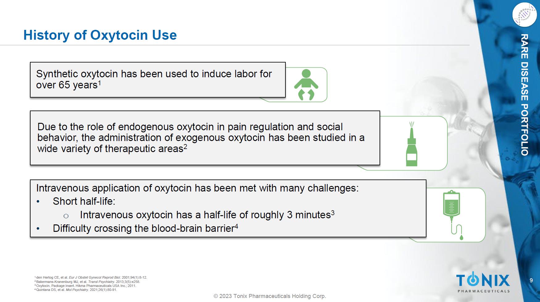 8 © 2023 Tonix Pharmaceuticals Holding Corp. RARE DISEASE PORTFOLIO Abnormalities of the Oxytocin System in Patients with PWS 1. Correa - da - Silva F, et al. J Neuroendocrinol . 2021;33(7):e12994. 2. Jurek B, et al. Physiol Rev . 2018;98(3):1805 - 1908. PWS patients have PVN=paraventricular nucleus. Increased oxytocin in blood plasma 1,2 Decreased or abnormal oxytocin neurons (especially in the PVN) 1 Decreased oxytocin mRNA 1 Low levels of oxytocin receptor expression 2