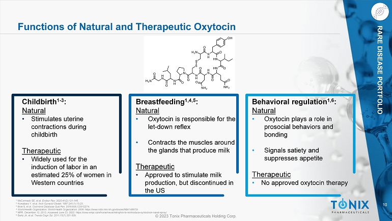9 © 2023 Tonix Pharmaceuticals Holding Corp. RARE DISEASE PORTFOLIO History of Oxytocin Use 1. den Hertog CE, et al. Eur J Obstet Gynecol Reprod Biol . 2001;94(1):8 - 12. 2. Bakermans - Kranenburg MJ, et al. Transl Psychiatry . 2013;3(5):e258. 3. Oxytocin. Package insert. Hikma Pharmaceuticals USA Inc.; 2011. 4. Quintana DS, et al. Mol Psychiatry. 2021;26(1):80 - 91. Due to the role of endogenous oxytocin in pain regulation and social behavior, the administration of exogenous oxytocin has been studied in a wide variety of therapeutic areas 2 Intravenous application of oxytocin has been met with many challenges: • Short half - life: o Intravenous oxytocin has a half - life of roughly 3 minutes 3 • Difficulty crossing the blood - brain barrier 4 Synthetic oxytocin has been used to induce labor for over 65 years 1
