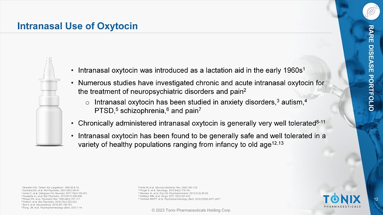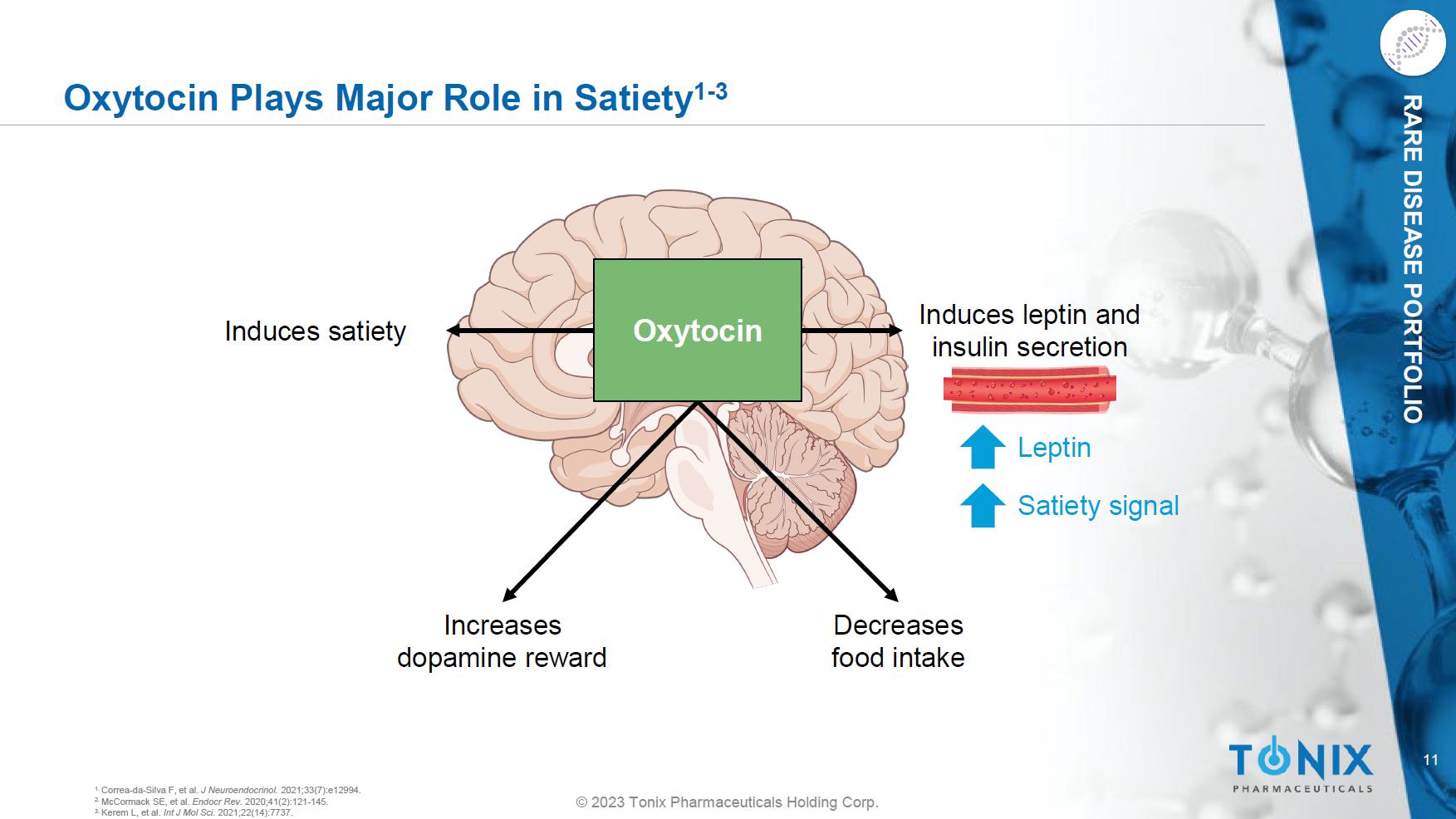 10 © 2023 Tonix Pharmaceuticals Holding Corp. RARE DISEASE PORTFOLIO Functions of Natural and Therapeutic Oxytocin 1. McCormack SE , et al. Endocr Rev. 2020;41(2):121 - 145. 2. Kuwabara Y, et al. Arch Gynecol Obstet . 1987;241(1):13 - 23. 3. Boie S, et al. Cochrane Database Syst Rev . 2018;8(8):CD012274. 4. World Health Organization. World Health Organization; 2009. https://www.ncbi.nlm.nih.gov/books/NBK148970/ 5. MPR. December 12, 2013. Accessed June 23, 2022. https://www.empr.com/home/news/retrophin - to - reintroduce - syntocinon - nasal - spray/ 6. Bartz JA, et al. Trends Cogn Sci . 2011;15(7):301 - 309. Childbirth 1 - 3 : Natural • Stimulates uterine contractions during childbirth Therapeutic • Widely used for the induction of labor in an estimated 25% of women in Western countries Breastfeeding 1,4,5 : Natural • Oxytocin is responsible for the let - down reflex • Contracts the muscles around the glands that produce milk Therapeutic • Approved to stimulate milk production, but discontinued in the US Behavioral regulation 1,6 : Natural • Oxytocin plays a role in prosocial behaviors and bonding • Signals satiety and suppresses appetite Therapeutic • No approved oxytocin therapy