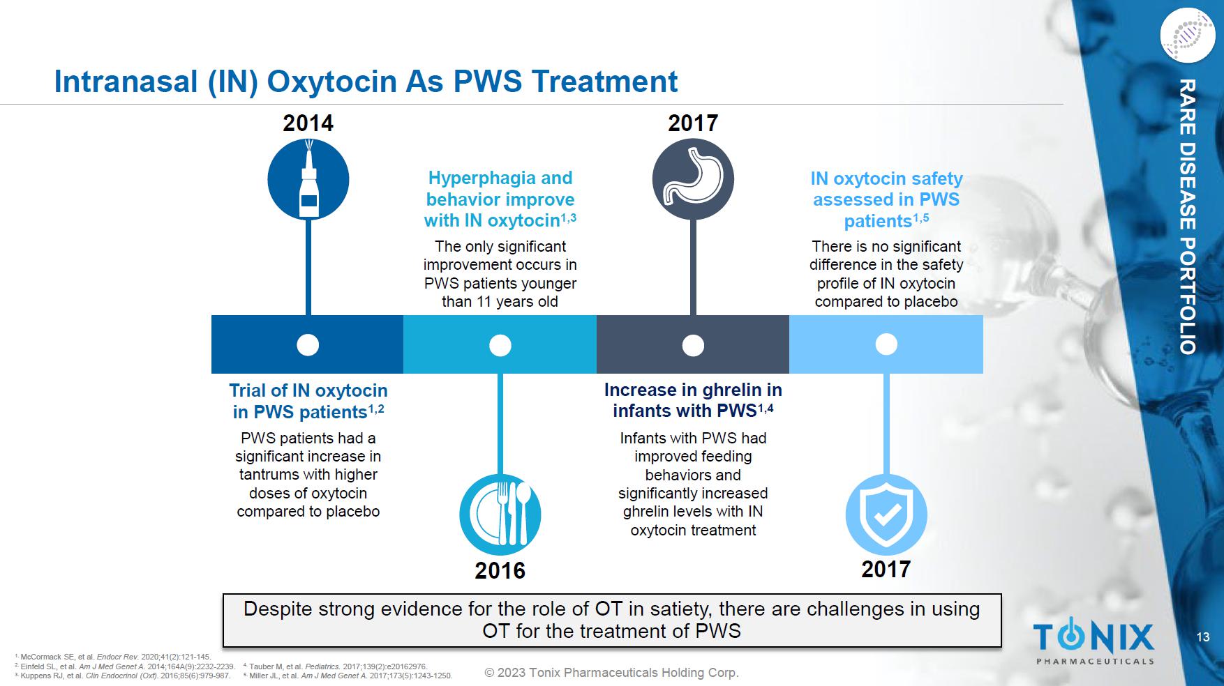 12 © 2023 Tonix Pharmaceuticals Holding Corp. RARE DISEASE PORTFOLIO Intranasal Use of Oxytocin • Intranasal oxytocin was introduced as a lactation aid in the early 1960s 1 • Numerous studies have investigated chronic and acute intranasal oxytocin for the treatment of neuropsychiatric disorders and pain 2 o Intranasal oxytocin has been studied in anxiety disorders, 3 autism, 4 PTSD, 5 schizophrenia, 6 and pain 7 • Chronically administered intranasal oxytocin is generally very well tolerated 8 - 11 • Intranasal oxytocin has been found to be generally safe and well tolerated in a variety of healthy populations ranging from infancy to old age 12,13 1. Skarsten KW. Tidsskr Nor Laegeforen . 1962;82:8 - 10. 2. Quintana DS, et al. Mol Psychiatry . 2021;26(1):80 - 91. 3. Jones C, et al. Dialogues Clin Neurosci . 2017;19(2):193 - 201. 4. Guastella AJ, et al. Biol Psychiatry. 2010;67(7):692 - 694. 5. Pitman RK, et al. Psychiatry Res. 1993;48(2):107 - 117. 6. Feifel D, et al. Biol Psychiatry . 2016;79(3):222 - 233. 7. Boll S, et al. Neuroscience . 2018;387:149 - 161. 8. Rung, JM, et al. Psychopharmacology (Berl). 2021;1 - 14. 9. Horta M, et al. Neurosci Biobehav Rev. 2020;108:1 - 23. 10. Finger E, et al. Neurology. 2015;84(2):174 - 181. 11. Barraza JA, et al. Exp Clin Psychopharmacol . 2013;21(2):85 - 92. 12. DeMayo MM, et al. Drugs . 2017;19(5):391 - 410. 13. Verhees MWFT, et al. Psychopharmacology (Berl). 2018;235(8):2471 - 2477.