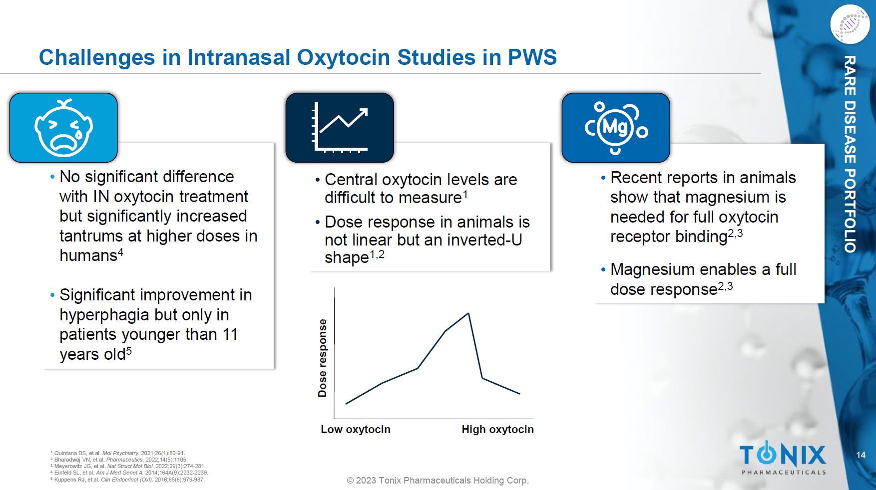 13 © 2023 Tonix Pharmaceuticals Holding Corp. RARE DISEASE PORTFOLIO Intranasal (IN) Oxytocin As PWS Treatment 1. McCormack SE , et al. Endocr Rev. 2020;41(2):121 - 145. 2. Einfeld SL, et al. Am J Med Genet A. 2014;164A(9):2232 - 2239. 3. Kuppens RJ, et al. Clin Endocrinol ( Oxf ). 2016;85(6):979 - 987. Despite strong evidence for the role of OT in satiety, there are challenges in using OT for the treatment of PWS 2014 Trial of IN oxytocin in PWS patients 1,2 PWS patients had a significant increase in tantrums with higher doses of oxytocin compared to placebo Hyperphagia and behavior improve with IN oxytocin 1,3 2016 The only significant improvement occurs in PWS patients younger than 11 years old Increase in ghrelin in infants with PWS 1,4 2017 Infants with PWS had improved feeding behaviors and significantly increased ghrelin levels with IN oxytocin treatment IN oxytocin safety assessed in PWS patients 1,5 2017 There is no significant difference in the safety profile of IN oxytocin compared to placebo 4. Tauber M, et al. Pediatrics. 2017;139(2):e20162976. 5. Miller JL, et al. Am J Med Genet A . 2017;173(5):1243 - 1250.