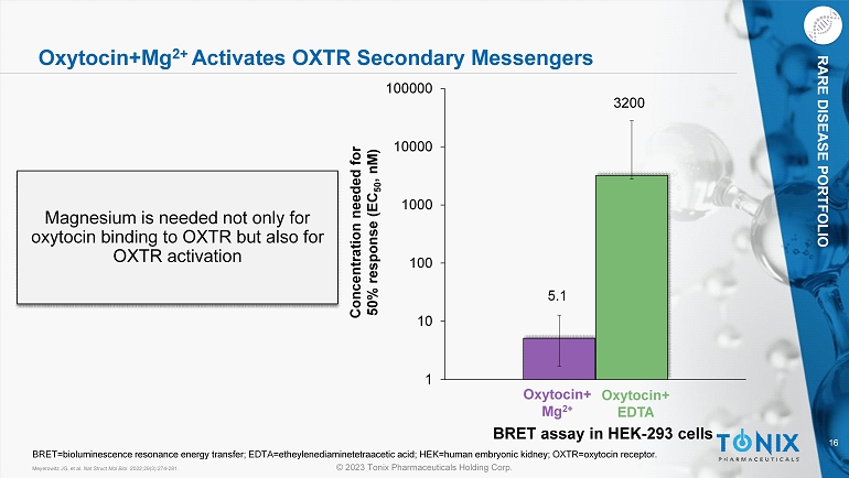 15 © 2023 Tonix Pharmaceuticals Holding Corp. RARE DISEASE PORTFOLIO Oxytocin Receptor (OXTR) 1 Jurek B, et al. Physiol Rev . 2018;98(3):1805 - 1908. 2 Meyerowitz JG, et al. Nat Struct Mol Biol. 2022;29(3):274 - 281. OXTR Signaling Cascade OXTR G q /11 Phospho - lipase C Ca 2+ Protein synthesis Unknown EGFR MAPK Oxytocin EGFR=epidermal growth factor receptor; MAPK=mitogen activated protein kinase; OXTR=oxytocin receptor 0.79 6.62 11 7 58.4 0 10 20 30 40 50 60 70 80 OXTR Binding to Agonists 1 K i values, nM (SD) Receptor agonists Oxytocin TGOT = highly selective agonist Atosiban = functionally selective agonist (can act as an antagonist depending on the G - protein coupled to OXTR) Carbetocin = oxytocin analog – weak agonist with mixed antagonist activity 2 WAY 267,464 = nonpeptide agonist more specific for the vasopressin receptor