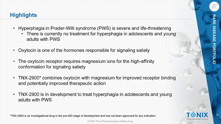 18 © 2023 Tonix Pharmaceuticals Holding Corp. RARE DISEASE PORTFOLIO Addition of Mg 2+ Expands the in vivo Useful Dose Range of Intranasal Oxytocin in Animals Bharadwaj VN, et al. Pharmaceutics . 2022;14(5):1105. • A nonlinear dose response has been demonstrated in the use of intranasal oxytocin • This decreases efficacy at higher doses • Addition of Mg 2+ rescues the efficacy of oxytocin at high doses 1 3 10 30 100 300 1000 0 5 10 15 20 Oxytocin only Oxytocin with 1.75 nM Mg 2+ * * * * Oxytocin dose ( nM ) Hyperpolarization (mV) In vitro whole - cell voltage - clamp recordings of rat trigeminal nerves exposed to oxytocin solution with and without additional magnesium ions * P <0.05