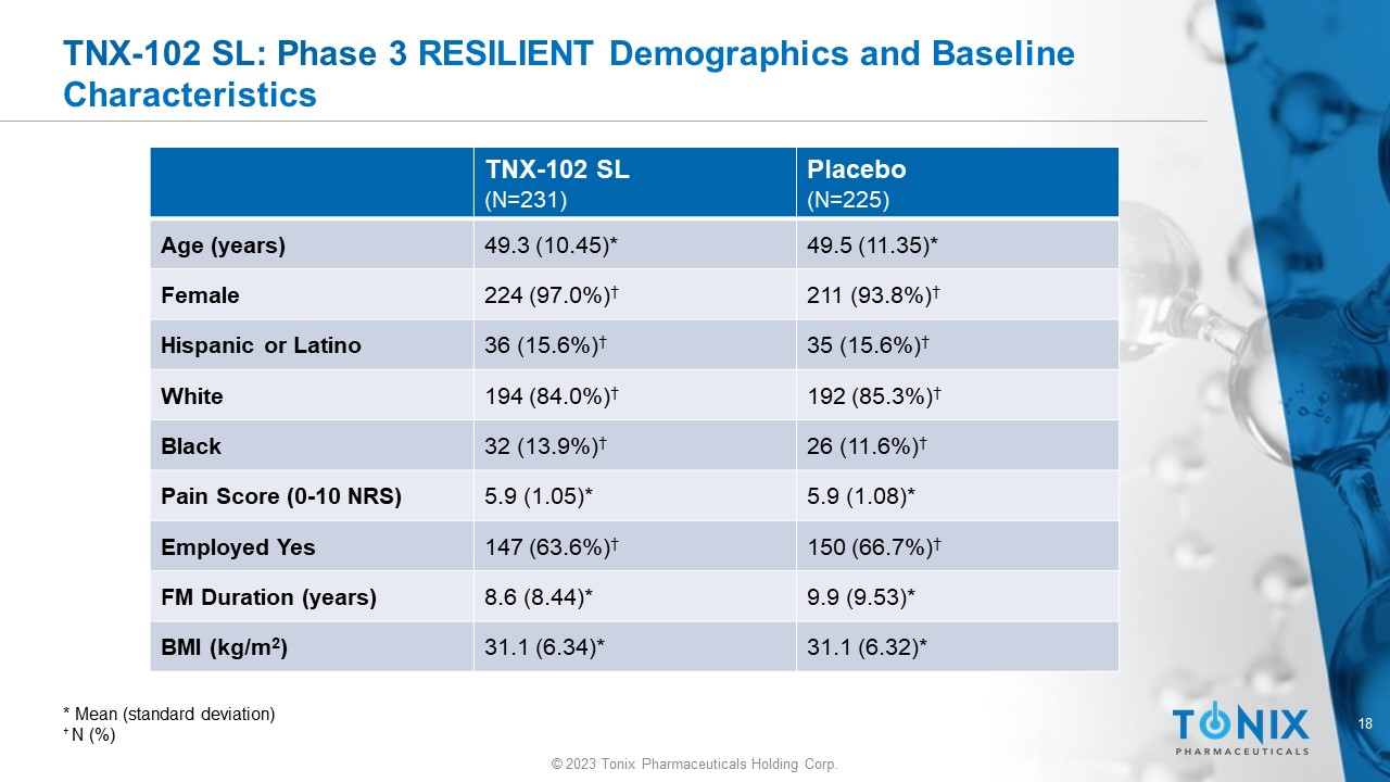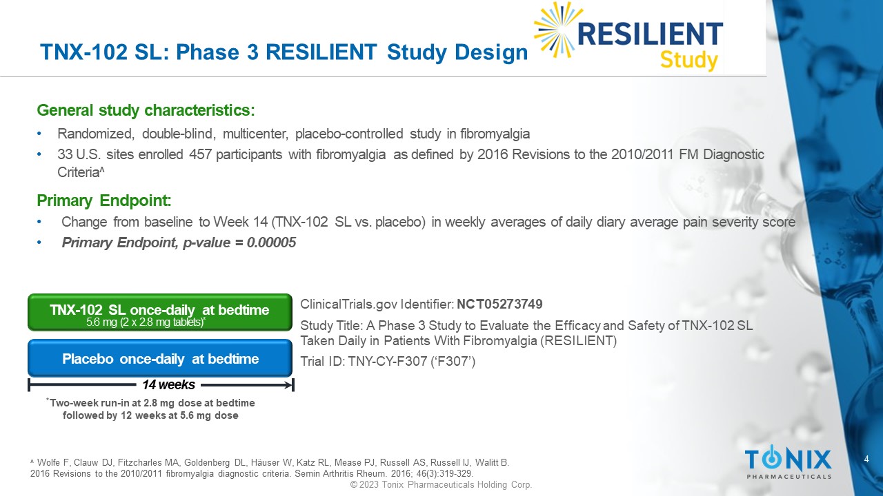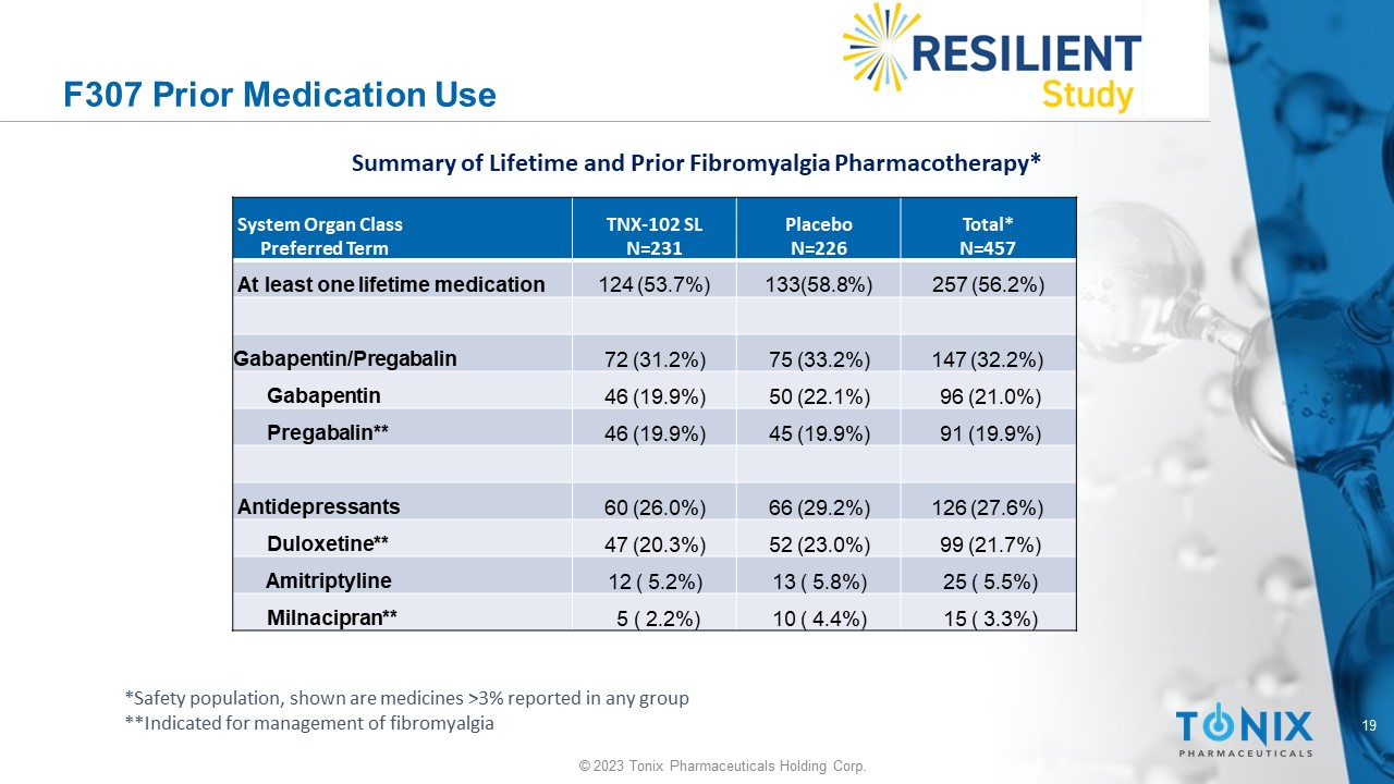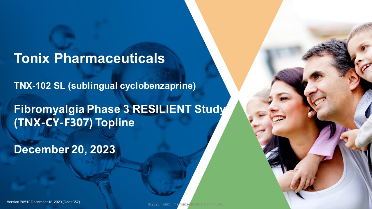 © 2023 Tonix Pharmaceuticals Holding Corp. Tonix Pharmaceuticals TNX - 102 SL (sublingual cyclobenzaprine) Fibromyalgia Phase 3 RESILIENT Study ( TNX - CY - F307 ) Topline December 20, 2023 Version P0512 December 18 , 2023 (Doc 1357 )