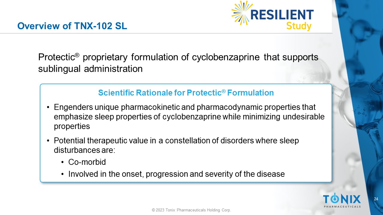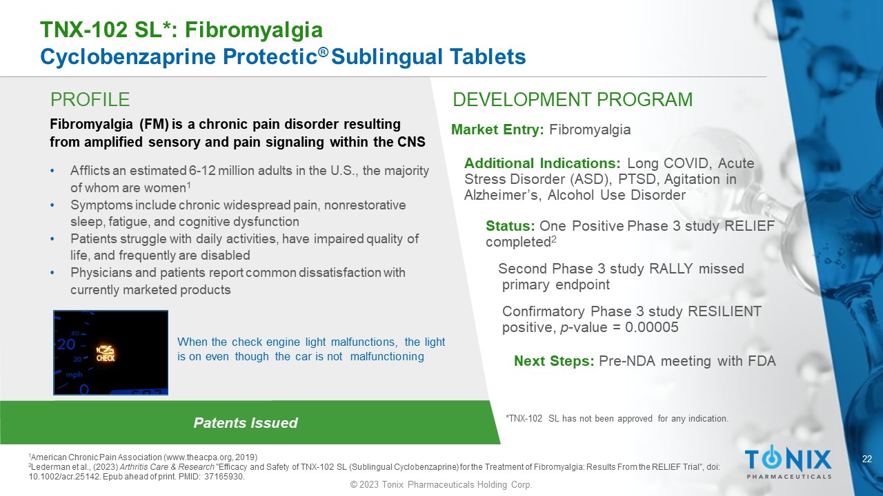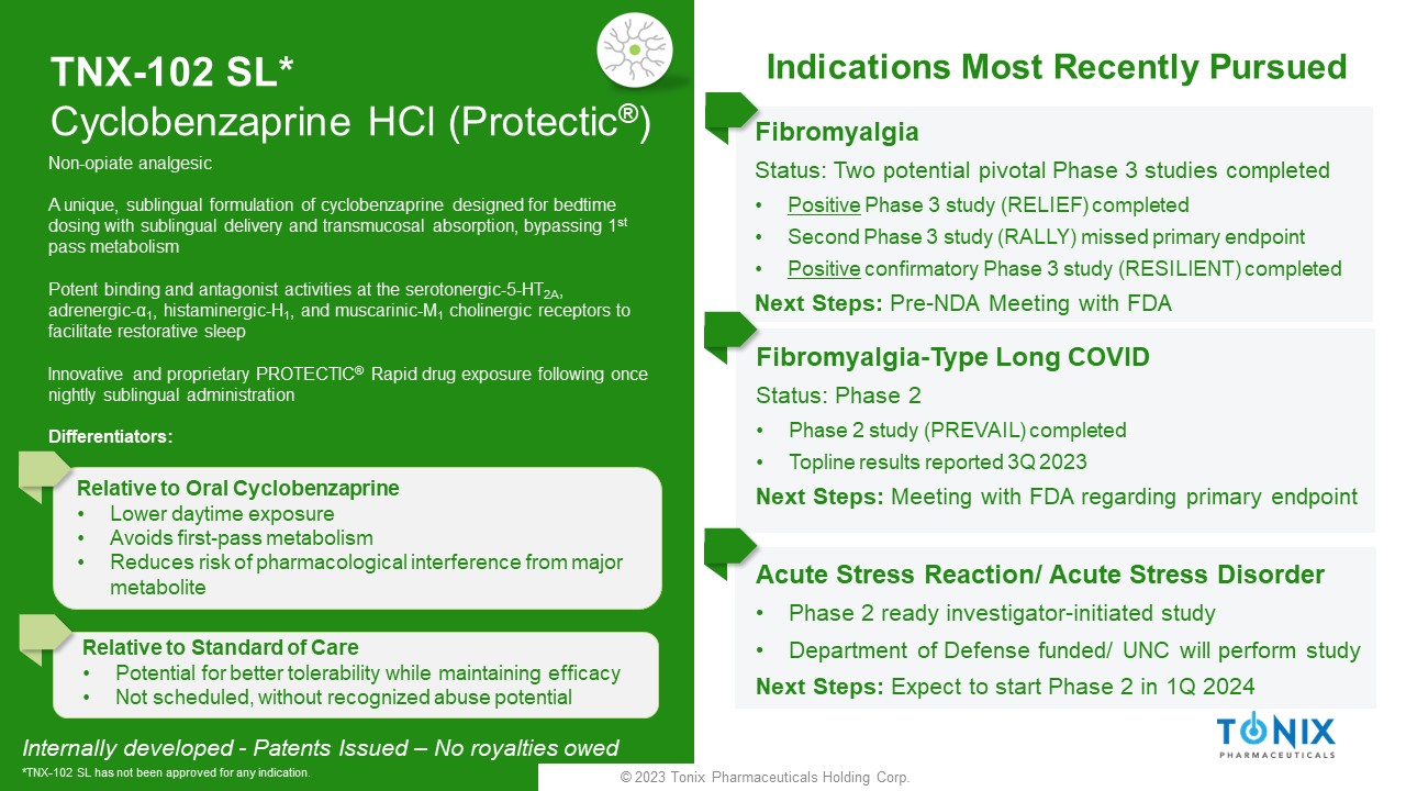 © 2023 Tonix Pharmaceuticals Holding Corp. TNX - 102 SL* Cyclobenzaprine HCl ( Protectic ® ) Fibromyalgia Status: Two potential pivotal Phase 3 studies completed • P ositive Phase 3 study (RELIEF) completed • Second Phase 3 study (RALLY) missed primary endpoint • Positive confirmatory Phase 3 study (RESILIENT) completed Next Steps: Pre - NDA Meeting with FDA Fibromyalgia - Type Long COVID Status: Phase 2 • Phase 2 study (PREVAIL) completed • Topline results reported 3Q 2023 Next Steps: Meeting with FDA regarding primary endpoint Internally developed - Patents Issued – No royalties owed *TNX - 102 SL has not been approved for any indication. Non - opiate analgesic A unique, sublingual formulation of cyclobenzaprine designed for bedtime dosing with sublingual delivery and transmucosal absorption, bypassing 1 st pass metabolism Potent binding and antagonist activities at the serotonergic - 5 - HT 2A , adrenergic - α 1 , histaminergic - H 1 , and muscarinic - M 1 cholinergic receptors to facilitate restorative sleep Innovative and proprietary PROTECTIC ® Rapid drug exposure following once nightly sublingual administration Differentiators: Relative to Oral Cyclobenzaprine • Lower daytime exposure • Avoids first - pass metabolism • Reduces risk of pharmacological interference from major metabolite Relative to Standard of Care • Potential for better tolerability while maintaining efficacy • Not scheduled, without recognized abuse potential Indications Most Recently Pursued Acute Stress Reaction/ Acute Stress Disorder • Phase 2 ready investigator - initiated study • Department of Defense funded/ UNC will perform study Next Steps: Expect to start Phase 2 in 1Q 2024