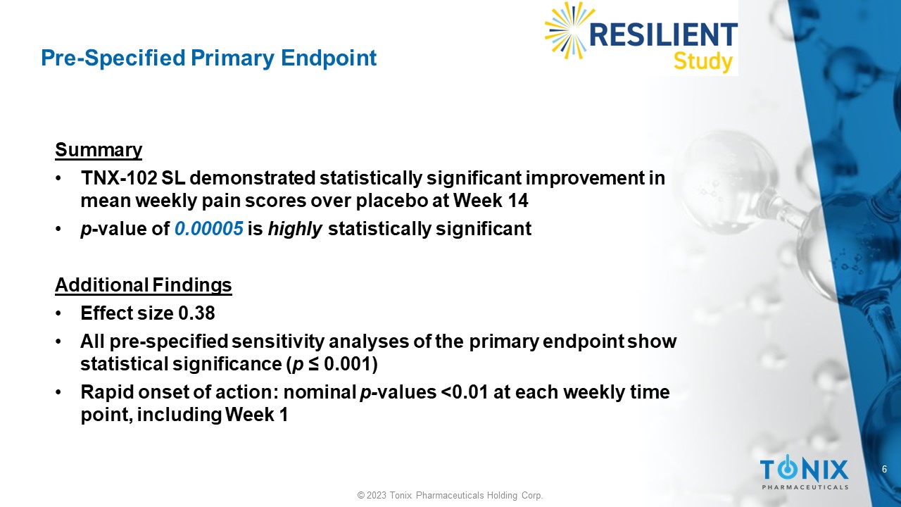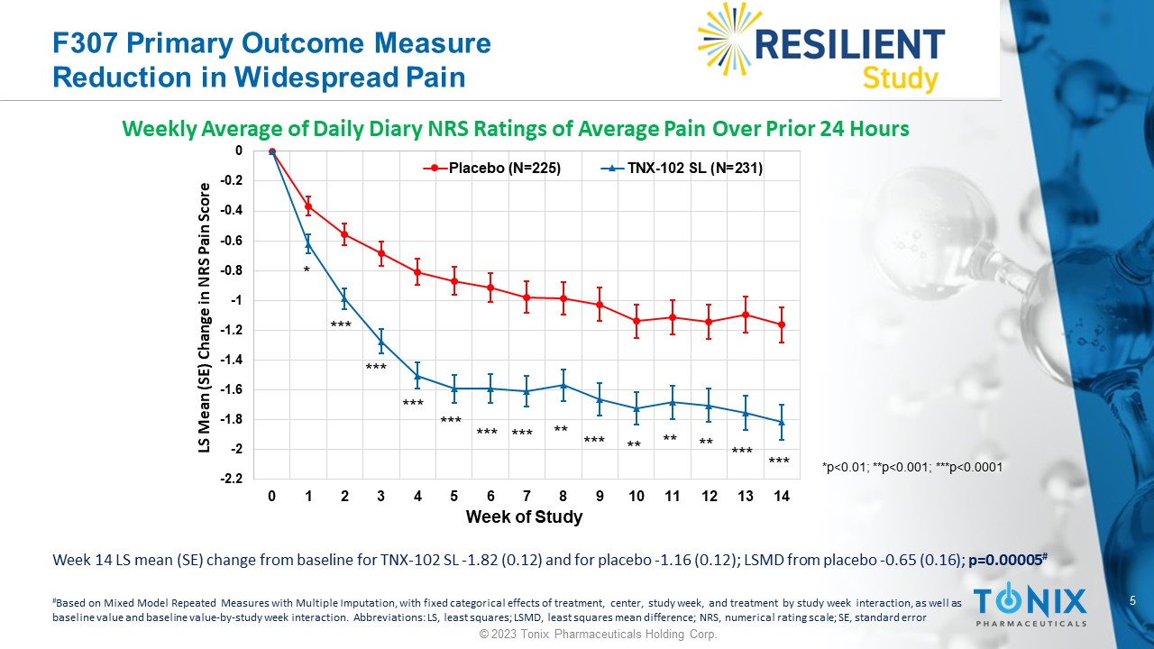 4 © 2023 Tonix Pharmaceuticals Holding Corp. TNX - 102 SL: Phase 3 RESILIENT Study Design General s tudy c haracteristics: • Randomized, double - blind, multicenter, placebo - controlle d study in fibromyalgia • 33 U.S. sites enrolled 457 participants with fibromyalgia as defined by 2016 Revisions to the 2010/2011 FM Diagnostic C riteria ^ Primary Endpoint: • Change from baseline to Week 14 (TNX - 102 SL vs. placebo) in weekly averages of daily diary average pain severity score • Primary Endpoint, p - value = 0.00005 Placebo once - daily at bedtime TNX - 102 SL once - daily at bedtime 5.6 mg (2 x 2.8 mg tablets) * * Two - week run - in at 2.8 mg dose at bedtime followed by 12 weeks at 5.6 mg dose ClinicalTrials.gov Identifier: NCT05273749 Study Title: A Phase 3 Study to Evaluate the Efficacy and Safety of TNX - 102 SL Taken Daily in Patients With Fibromyalgia (RESILIENT) Trial ID: TNY - CY - F307 (‘F307’) 14 weeks ^ Wolfe F, Clauw DJ, Fitzcharles MA, Goldenberg DL, Häuser W, Katz RL, Mease PJ, Russell AS, Russell IJ, Walitt B. 2016 Revisions to the 2010/2011 fibromyalgia diagnostic criteria. Semin Arthritis Rheum. 2016; 46(3):319 - 329.