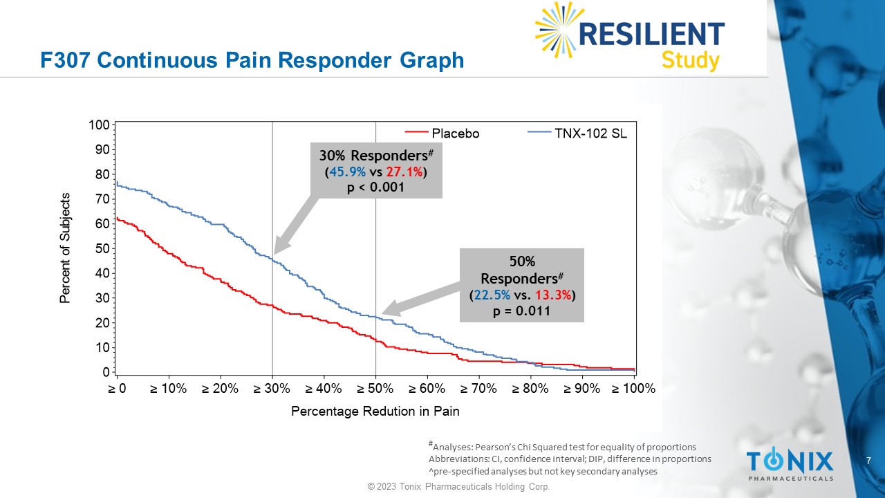 6 © 2023 Tonix Pharmaceuticals Holding Corp. Pre - Specified Primary Endpoint Summary • TNX - 102 SL demonstrated statistically significant improvement in mean weekly pain scores over placebo at Week 14 • p - value of 0.00005 is highly statistically significant Additional Findings • Effect size 0.38 • All pre - specified sensitivity analyses of the primary endpoint show statistical significance ( p ≤ 0.001) • Rapid onset of action: nominal p - values <0.01 at each weekly time point, including Week 1