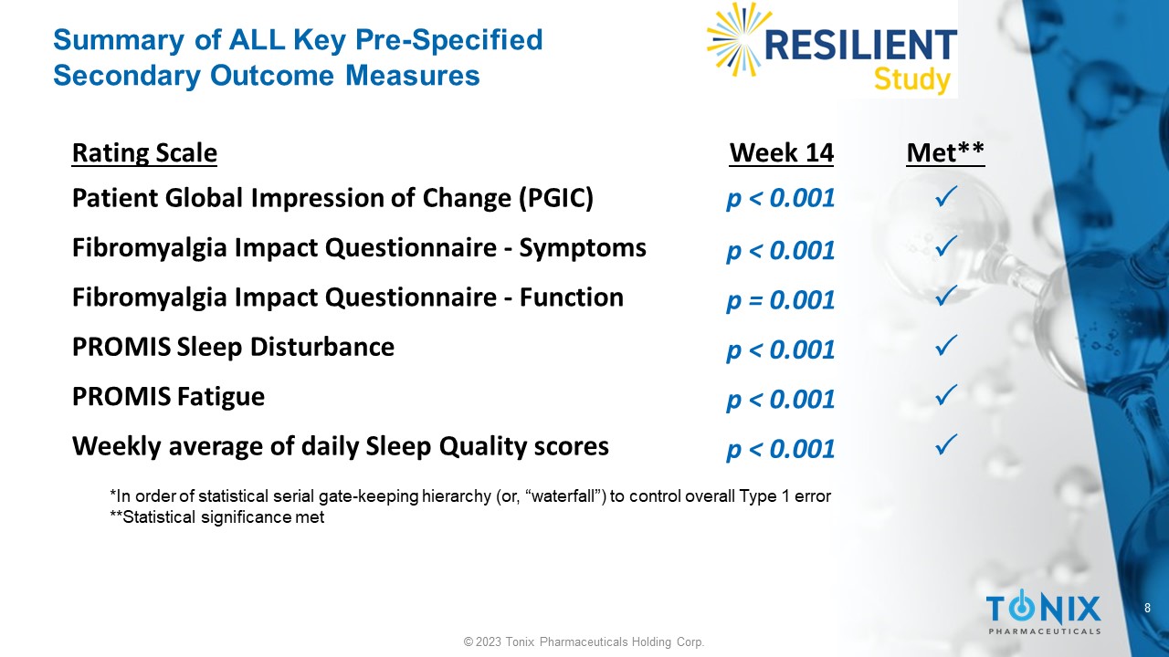 7 © 2023 Tonix Pharmaceuticals Holding Corp. F307 Continuous Pain Responder Graph # Analyses: Pearson’s Chi Squared test for equality of proportions Abbreviations: CI, confidence interval; DIP, difference in proportions ^pre - specified analyses but not key secondary analyses P e r c e n t o f S u b j e c t s 0 10 20 30 40 50 60 70 80 90 100 Percentage Redution in Pain ≥ 0 ≥ 10% ≥ 20% ≥ 30% ≥ 40% ≥ 50% ≥ 60% ≥ 70% ≥ 80% ≥ 90% ≥ 100% Placebo TNX-102 SL 30% Responders # ( 45.9% vs 27.1% ) p < 0.001 50% Responders # ( 22.5% vs. 13.3% ) p = 0.011