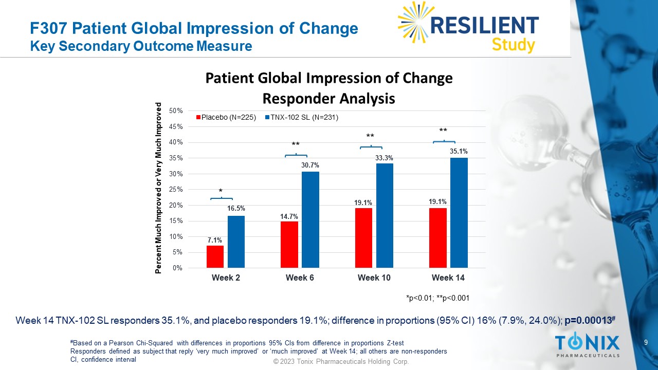 8 © 2023 Tonix Pharmaceuticals Holding Corp. Summary of ALL Key Pre - Specified Secondary Outcome Measures *In order of statistical serial gate - keeping hierarchy (or, “waterfall”) to control overall Type 1 error **Statistical significance met Met** Week 14 Rating Scale p < 0.001 Patient Global Impression of Change (PGIC) p < 0.001 Fibromyalgia Impact Questionnaire - Symptoms p = 0.001 Fibromyalgia Impact Questionnaire - Function p < 0.001 PROMIS Sleep Disturbance p < 0.001 PROMIS Fatigue p < 0.001 Weekly average of daily Sleep Quality scores