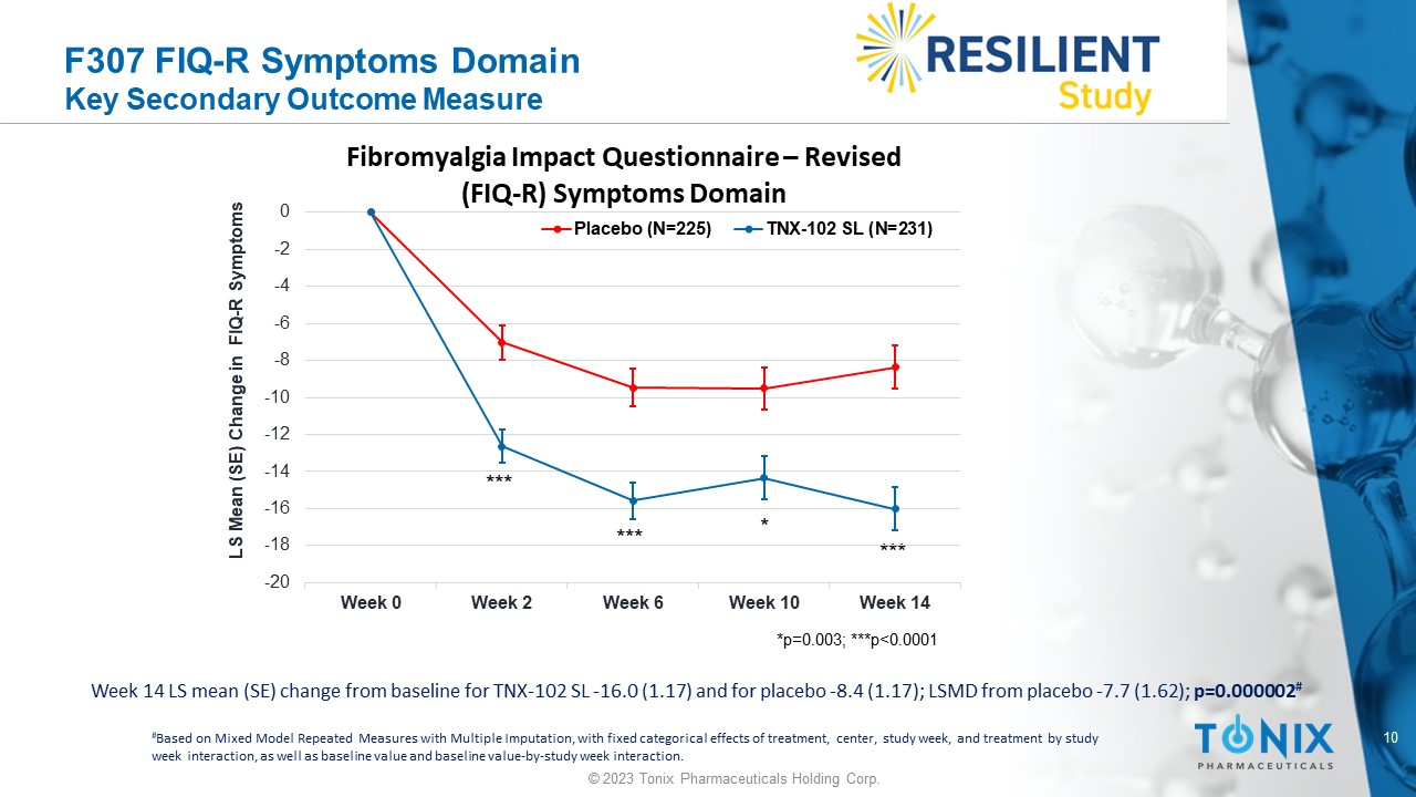 9 © 2023 Tonix Pharmaceuticals Holding Corp. F307 Patient Global Impression of Change Key Secondary Outcome Measure Week 14 TNX - 102 SL responders 35.1%, and placebo responders 19.1%; difference in proportions (95% CI) 16% (7.9%, 24.0%); p=0.00013 # # Based on a Pearson Chi - Squared with differences in proportions 95% CIs from difference in proportions Z - test Responders defined as subject that reply ‘very much improved’ or ‘much improved’ at Week 14; all others are non - responders CI, confidence interval 7.1% 14.7% 19.1% 19.1% 16.5% 30.7% 33.3% 35.1% 0% 5% 10% 15% 20% 25% 30% 35% 40% 45% 50% Week 2 Week 6 Week 10 Week 14 Patient Global Impression of Change Responder Analysis Placebo (N=225) TNX-102 SL (N=231) Percent Much Improved or Very Much Improved *p<0.01; **p<0.001 * ** ** **
