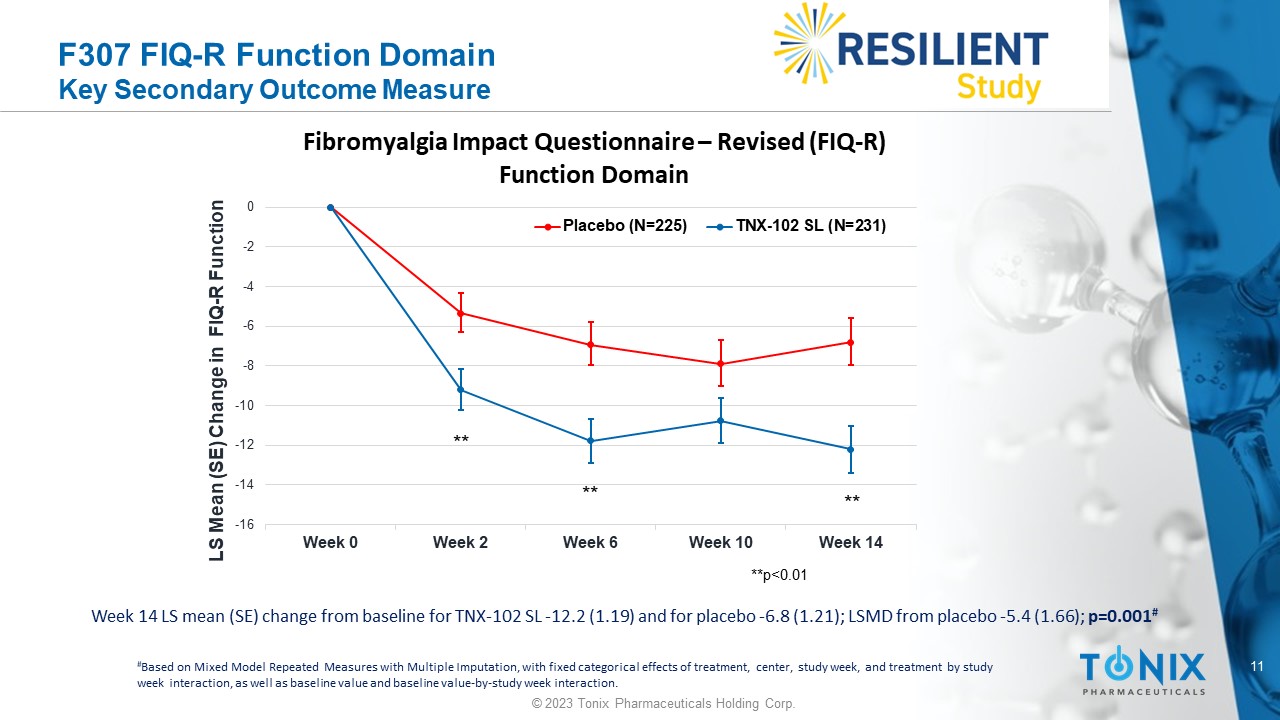 10 © 2023 Tonix Pharmaceuticals Holding Corp. F307 FIQ - R Symptoms Domain Key Secondary Outcome Measure * *** *** *** Week 14 LS mean (SE) change from baseline for TNX - 102 SL - 16.0 (1.17) and for placebo - 8.4 (1.17); LSMD from placebo - 7.7 (1.62) ; p=0.000002 # # Based on Mixed Model Repeated Measures with Multiple Imputation, with fixed categorical effects of treatment, center, study w eek , and treatment by study week interaction, as well as baseline value and baseline value - by - study week interaction. -20 -18 -16 -14 -12 -10 -8 -6 -4 -2 0 Week 0 Week 2 Week 6 Week 10 Week 14 LS Mean (SE) Change in FIQ - R Symptoms Fibromyalgia Impact Questionnaire – Revised (FIQ - R) Symptoms Domain Placebo (N=225) TNX-102 SL (N=231) *p=0.003; ***p<0.0001
