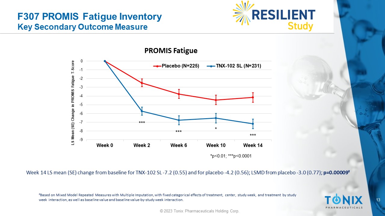 12 © 2023 Tonix Pharmaceuticals Holding Corp. F307 PROMIS Sleep Disturbance Inventory Key Secondary Outcome Measure Week 14 LS mean (SE) change from baseline for TNX - 102 SL - 8.4 (0.57) and for placebo - 4.2 (0.56); LSMD from placebo - 4.2 (0.79); p=0.0000001 # # Based on Mixed Model Repeated Measures with Multiple Imputation, with fixed categorical effects of treatment, center, study w eek , and treatment by study week interaction, as well as baseline value and baseline value - by - study week interaction. -10 -9 -8 -7 -6 -5 -4 -3 -2 -1 0 Week 0 Week 2 Week 6 Week 10 Week 14 LS Mean (SE) Change in PROMIS SD T - score PROMIS Sleep Disturbance Placebo (N=225) TNX-102 SL (N=231) *p<0.001; ***p<0.00001 * *** *** ***