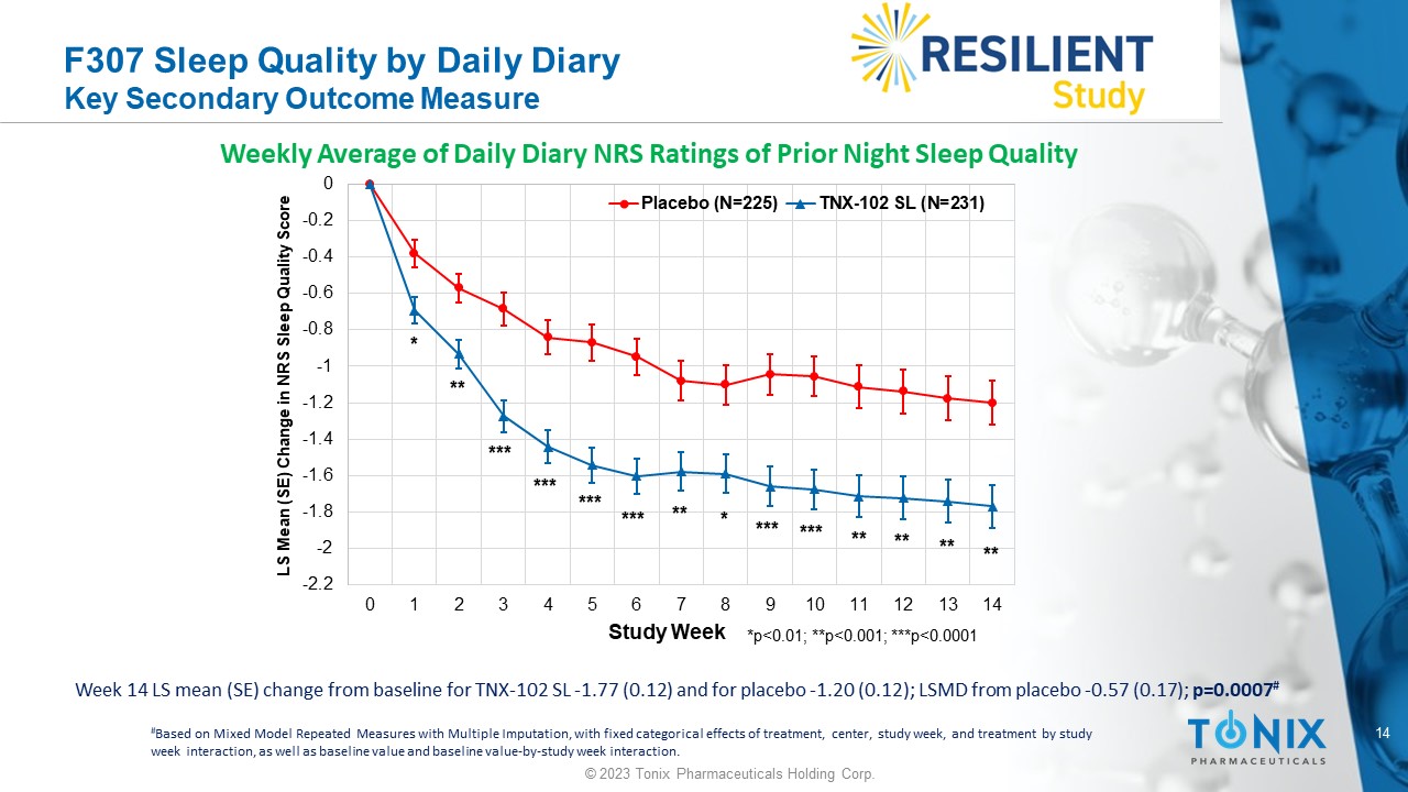 13 © 2023 Tonix Pharmaceuticals Holding Corp. F307 PROMIS Fatigue Inventory Key Secondary Outcome Measure Week 14 LS mean (SE) change from baseline for TNX - 102 SL - 7.2 (0.55) and for placebo - 4.2 (0.56); LSMD from placebo - 3.0 (0.77); p=0.00009 # # Based on Mixed Model Repeated Measures with Multiple Imputation, with fixed categorical effects of treatment, center, study w eek , and treatment by study week interaction, as well as baseline value and baseline value - by - study week interaction. -9 -8 -7 -6 -5 -4 -3 -2 -1 0 Week 0 Week 2 Week 6 Week 10 Week 14 LS Mean (SE) Change in PROMIS Fatigue T - Score PROMIS Fatigue Placebo (N=225) TNX-102 SL (N=231) *p<0.01; ***p<0.0001 * *** *** ***