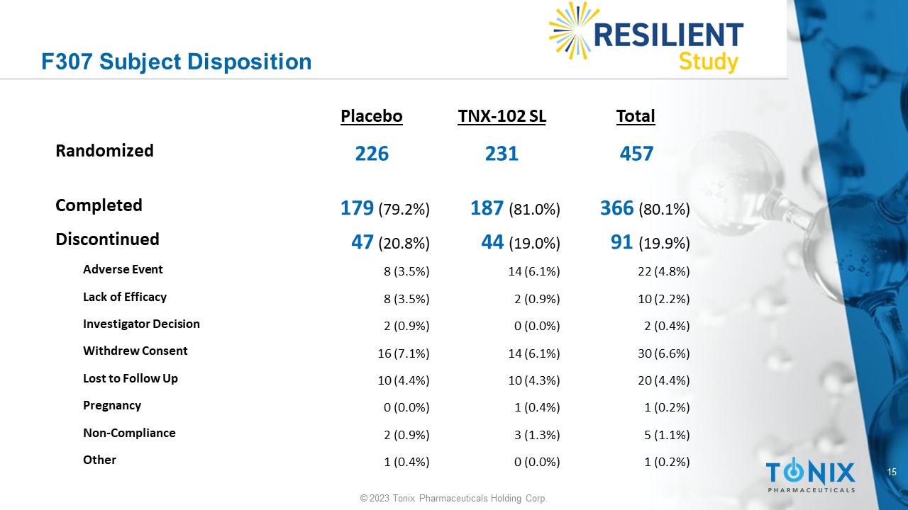 14 © 2023 Tonix Pharmaceuticals Holding Corp. F307 Sleep Quality by Daily Diary Key Secondary Outcome Measure Week 14 LS mean (SE) change from baseline for TNX - 102 SL - 1.77 (0.12) and for placebo - 1.20 (0.12); LSMD from placebo - 0.57 (0.1 7); p=0.0007 # Weekly Average of Daily Diary NRS Ratings of Prior Night Sleep Quality -2.2 -2 -1.8 -1.6 -1.4 -1.2 -1 -0.8 -0.6 -0.4 -0.2 0 0 1 2 3 4 5 6 7 8 9 10 11 12 13 14 LS Mean (SE) Change in NRS Sleep Quality Score Study Week Placebo (N=225) TNX-102 SL (N=231) *p<0.01; **p<0.001; ***p<0.0001 *** * ** ** * ** *** ** ** ** *** *** *** *** # Based on Mixed Model Repeated Measures with Multiple Imputation, with fixed categorical effects of treatment, center, study w eek , and treatment by study week interaction, as well as baseline value and baseline value - by - study week interaction.