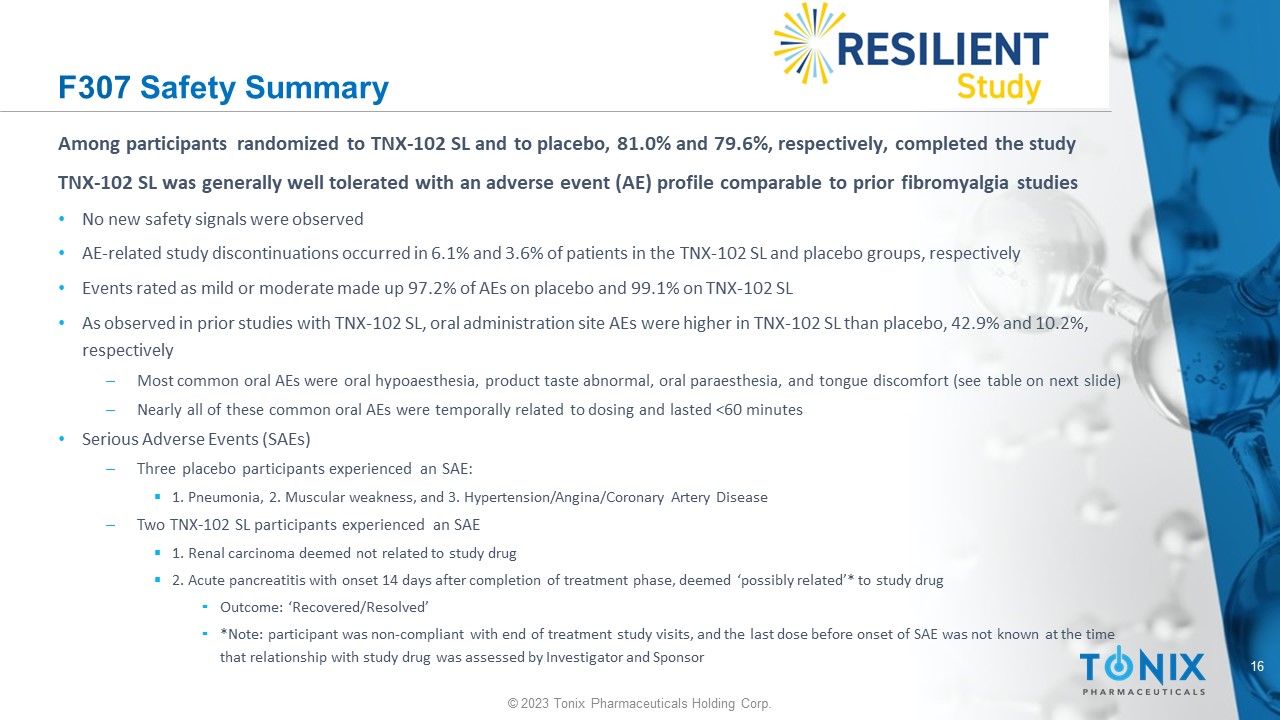 15 © 2023 Tonix Pharmaceuticals Holding Corp. F307 Subject Disposition Total TNX - 102 SL Placebo 457 231 226 Randomized 366 (80.1%) 187 (81.0%) 179 (79.2%) Completed 91 (19.9%) 44 (19.0%) 47 (20.8%) Discontinued 22 (4.8%) 14 (6.1%) 8 (3.5%) Adverse Event 10 (2.2%) 2 (0.9%) 8 (3.5%) Lack of Efficacy 2 (0.4%) 0 (0.0%) 2 (0.9%) Investigator Decision 30 (6.6%) 14 (6.1%) 16 (7.1%) Withdrew Consent 20 (4.4%) 10 (4.3%) 10 (4.4%) Lost to Follow Up 1 (0.2%) 1 (0.4%) 0 (0.0%) Pregnancy 5 (1.1%) 3 (1.3%) 2 (0.9%) Non - Compliance 1 (0.2%) 0 (0.0%) 1 (0.4%) Other