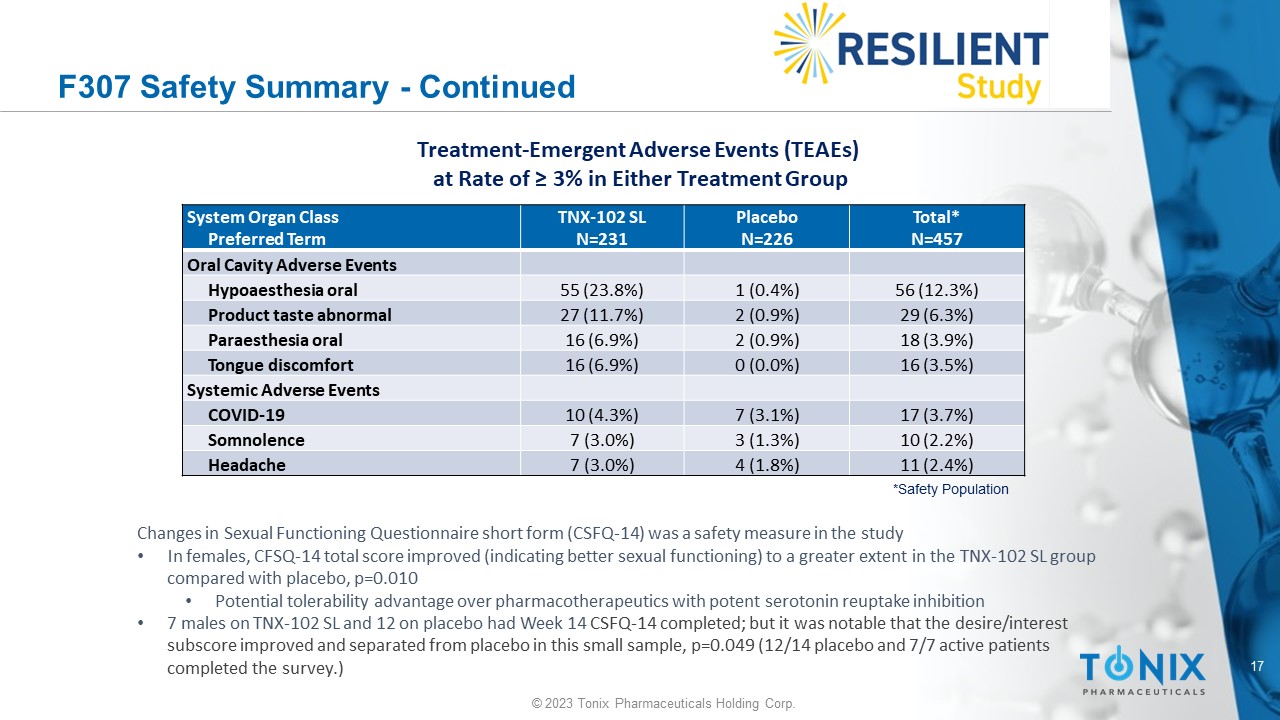 16 © 2023 Tonix Pharmaceuticals Holding Corp. F307 Safety Summary Among participants randomized to TNX - 102 SL and to placebo, 81.0% and 79.6%, respectively, completed the study TNX - 102 SL was generally well tolerated with an adverse event (AE) profile comparable to prior fibromyalgia studies • No new safety signals were observed • AE - related study discontinuations occurred in 6.1% and 3.6% of patients in the TNX - 102 SL and placebo groups, respectively • Events rated as mild or moderate made up 97.2% of AEs on placebo and 99.1% on TNX - 102 SL • As observed in prior studies with TNX - 102 SL, oral administration site AEs were higher in TNX - 102 SL than placebo, 42.9% and 10. 2%, respectively ‒ Most common oral AEs were oral hypoaesthesia, product taste abnormal, oral paraesthesia, and tongue discomfort (see table on nex t slide) ‒ Nearly all of these common oral AEs were temporally related to dosing and lasted <60 minutes • Serious Adverse Events (SAEs) ‒ Three placebo participants experienced an SAE: ▪ 1. Pneumonia, 2. Muscular weakness, and 3. Hypertension/Angina/Coronary Artery Disease ‒ Two TNX - 102 SL participants experienced an SAE ▪ 1. Renal carcinoma deemed not related to study drug ▪ 2. Acute pancreatitis with onset 14 days after completion of treatment phase, deemed ‘possibly related’* to study drug ⁃ Outcome: ‘Recovered/Resolved’ ⁃ *Note: participant was non - compliant with end of treatment study visits, and the last dose before onset of SAE was not known at the time that relationship with study drug was assessed by Investigator and Sponsor
