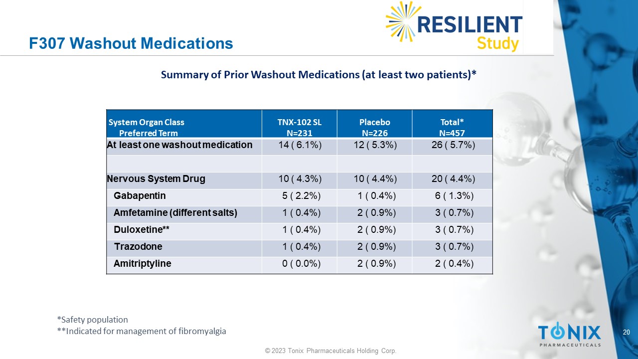 19 © 2023 Tonix Pharmaceuticals Holding Corp. F307 Prior Medication Use Total* N=457 Placebo N=226 TNX - 102 SL N=231 System Organ Class Preferred Term 257 (56.2%) 133(58.8%) 124 (53.7%) At least one lifetime medication 147 (32.2%) 75 (33.2%) 72 (31.2%) Gabapentin/Pregabalin 96 (21.0%) 50 (22.1%) 46 (19.9%) Gabapentin 91 (19.9%) 45 (19.9%) 46 (19.9%) Pregabalin** 126 (27.6%) 66 (29.2%) 60 (26.0%) Antidepressants 99 (21.7%) 52 (23.0%) 47 (20.3%) Duloxetine** 25 ( 5.5%) 13 ( 5.8%) 12 ( 5.2%) Amitriptyline 15 ( 3.3%) 10 ( 4.4%) 5 ( 2.2%) Milnacipran** Summary of Lifetime and Prior Fibromyalgia Pharmacotherapy* *Safety population, shown are medicines >3% reported in any group **Indicated for management of fibromyalgia