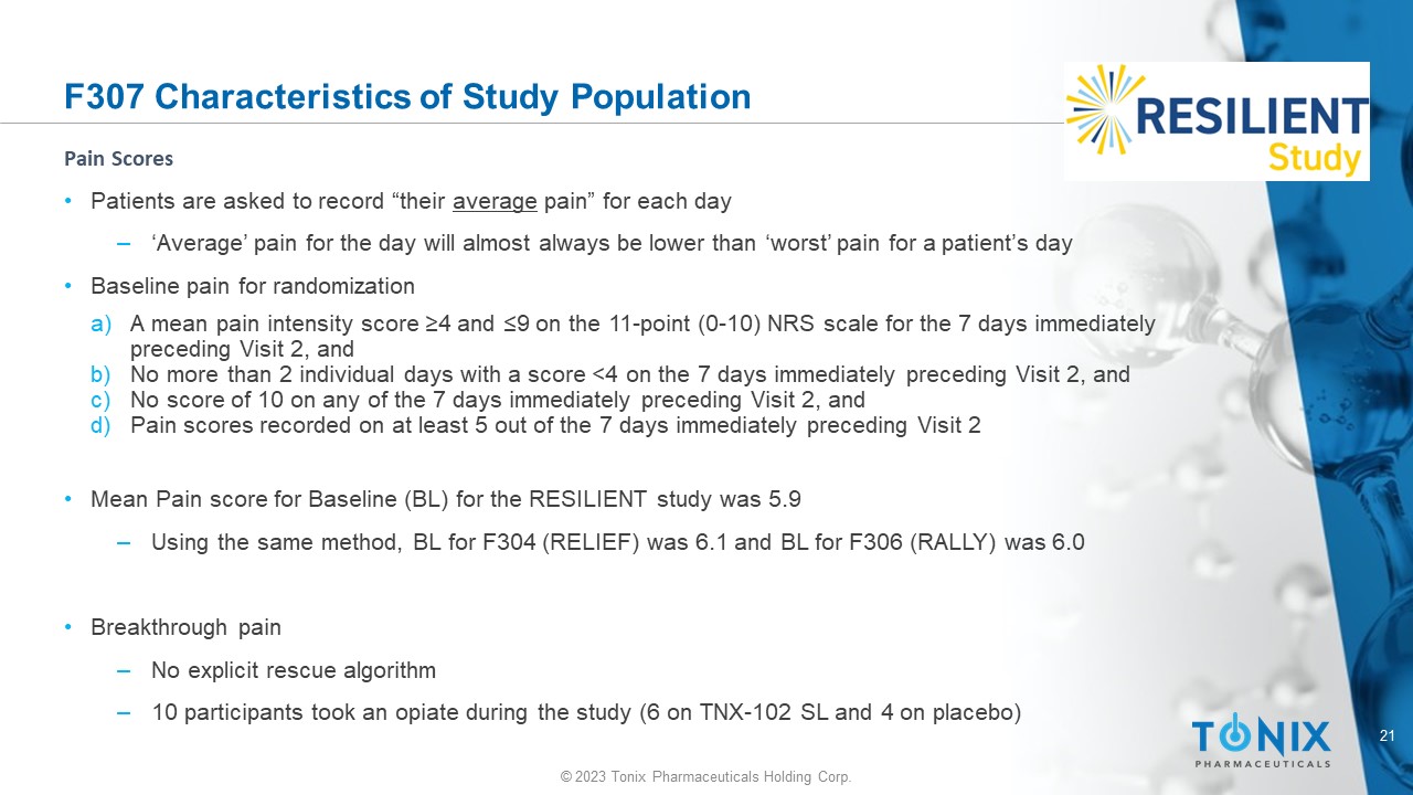20 © 2023 Tonix Pharmaceuticals Holding Corp. F307 Washout Medications Total* N=457 Placebo N=226 TNX - 102 SL N=231 System Organ Class Preferred Term 26 ( 5.7%) 12 ( 5.3%) 14 ( 6.1%) At least one washout medication 20 ( 4.4%) 10 ( 4.4%) 10 ( 4.3%) Nervous System Drug 6 ( 1.3%) 1 ( 0.4%) 5 ( 2.2%) Gabapentin 3 ( 0.7%) 2 ( 0.9%) 1 ( 0.4%) Amfetamine (different salts) 3 ( 0.7%) 2 ( 0.9%) 1 ( 0.4%) Duloxetine** 3 ( 0.7%) 2 ( 0.9%) 1 ( 0.4%) Trazodone 2 ( 0.4%) 2 ( 0.9%) 0 ( 0.0%) Amitriptyline Summary of Prior Washout Medications (at least two patients)* *Safety population **Indicated for management of fibromyalgia