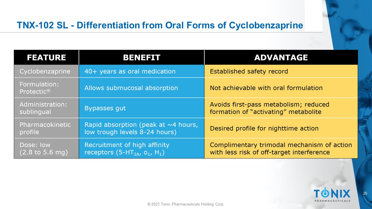 24 © 2023 Tonix Pharmaceuticals Holding Corp. Overview of TNX - 102 SL Scientific Rationale for Protectic ® Formulation • Engenders unique pharmacokinetic and pharmacodynamic properties that emphasize sleep properties of cyclobenzaprine while minimizing undesirable properties • Potential therapeutic value in a constellation of disorders where sleep disturbances are: • Co - morbid • Involved in the onset, progression and severity of the disease Protectic ® proprietary formulation of cyclobenzaprine that supports sublingual administration