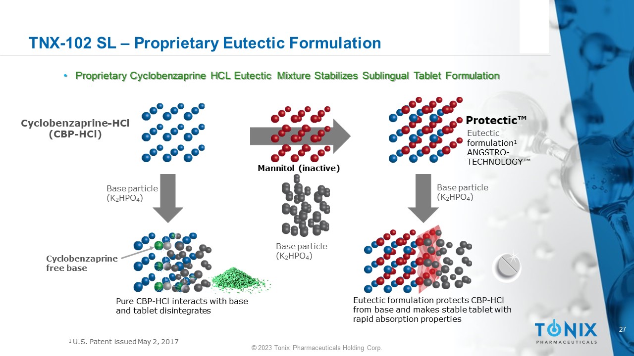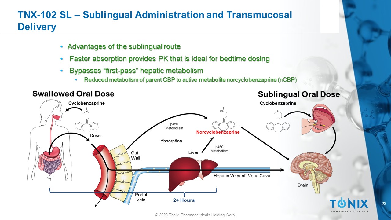 27 © 2023 Tonix Pharmaceuticals Holding Corp. TNX - 102 SL – Proprietary Eutectic Formulation • Proprietary Cyclobenzaprine HCL Eutectic Mixture Stabilizes Sublingual Tablet Formulation Base particle (K 2 HPO 4 ) Base particle (K 2 HPO 4 ) Base particle (K 2 HPO 4 ) C y cl o be n z a p r i n e - HCl (CBP - HCl) Eutectic formulation protects CBP - HCl from base and makes stable tablet with rapid absorption properties Pure CBP - HCl interacts with base and tablet disintegrates Cy c l ob en zapr ine free base Protectic Eutectic formulation 1 ANGSTRO - T E C H NO L O GY Mannitol (inactive) 1 U.S. Patent issued May 2, 2017